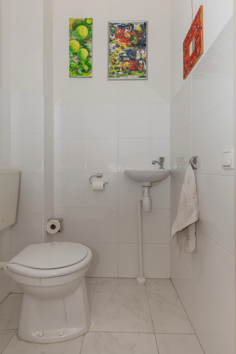 Er is verder een ruime badkamer. Deze is geheel wit betegeld en voorzien van een toilet, wastafel met kast, wasmachine-aansluiting, douchehoek en er is voldoende daglicht.