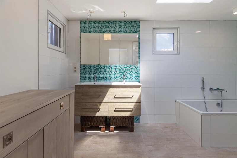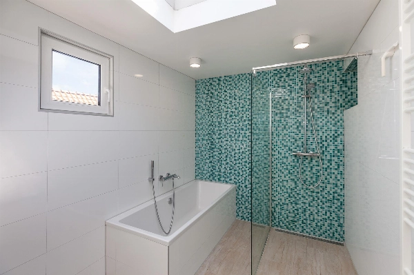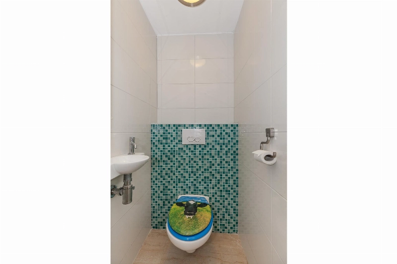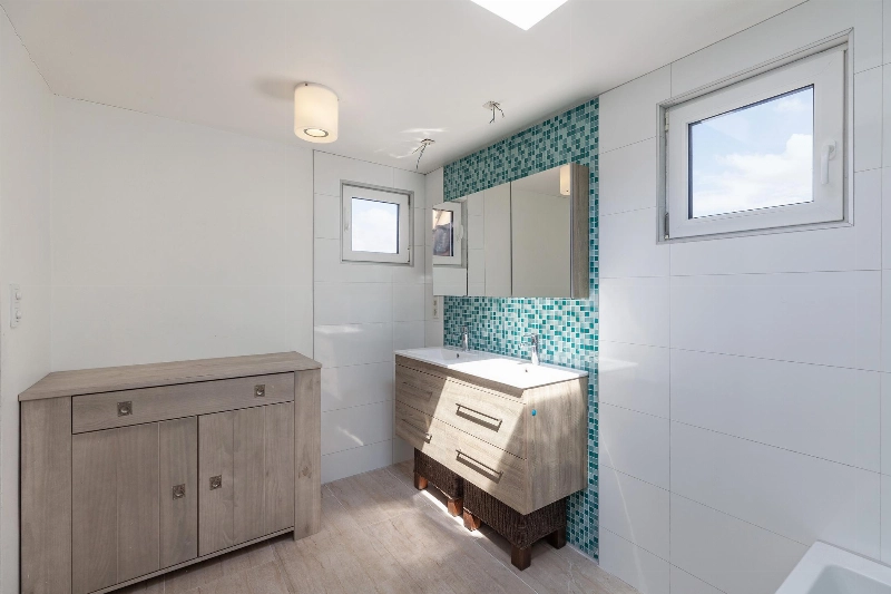 De badkamer is in 2016 nieuw geplaatst en gedeeltelijk uitgebouwd op een voormalig terras. Hierdoor is een heerlijk ruime badkamer ontstaan van 4.08 x 2.17m. De badkamer is gedeeltelijk betegeld en voorzien van een ligbad, dubbele wastafel, radiator, daklicht en 2 kleine kunststof raampjes zorgen voor daglicht. De voetjes blijven door de vloerverwarming warm in de winter.