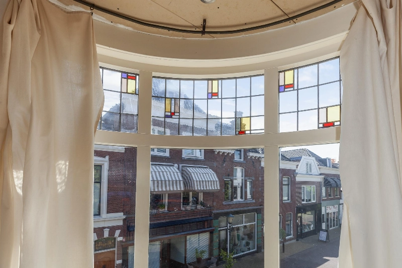 Als je bovenkomt sta je meteen in de riante woonkamer. Deze heeft 6 mooie ramen waarvan het glas-in-lood tussen het dubbel glas is geplaatst. Vanaf hier heb je een leuk zicht over de winkelstraat! Deze ruime woonkamer heeft een mooie zithoek en aan de achterzijde ligt de open keuken. Ook hier weer een mooie ruimte alwaar de modern landelijke grijze hoekopstelling met een kunststof werkblad is geplaatst. Deze keuken is voorzien van vaatwasser, 6 pits gaskookplaat, een dubbele oven en veel kastruimte. Achter de keuken ligt een gang. Deze is in 2024 aangebouwd en geeft toegang tot het dakterras.