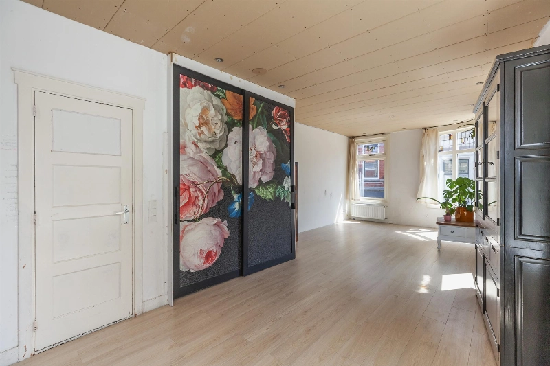 In de woonkamer vind je 2 kastruimtes en een dubbele schuifdeur naar de trap naar de 2e verdieping.