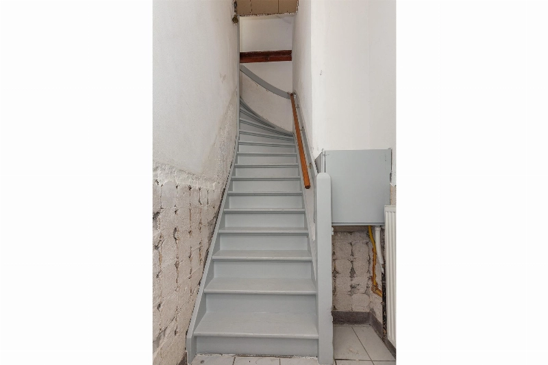 Op de hoek van het pand vind je de entree op de begane grond. Hier is een kleine hal met trap naar de 1e verdieping.