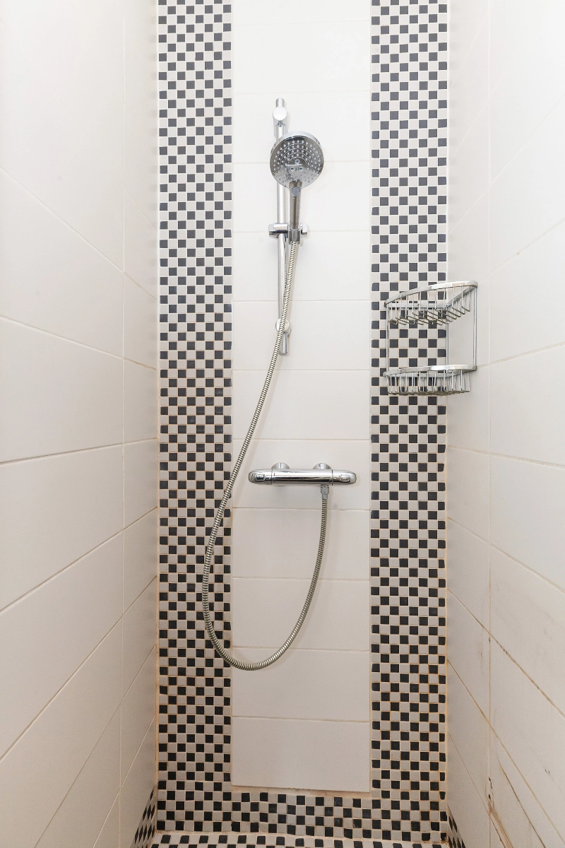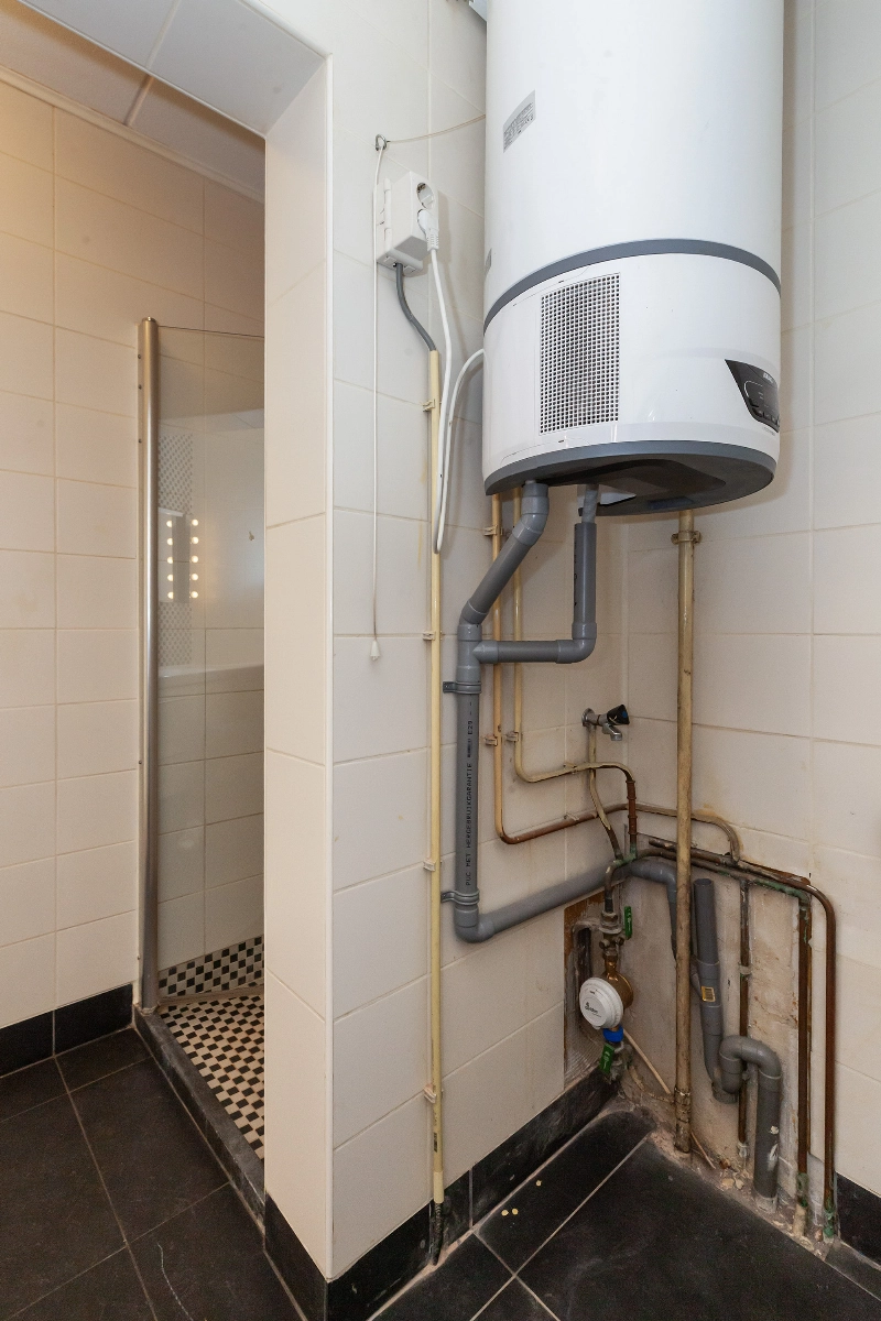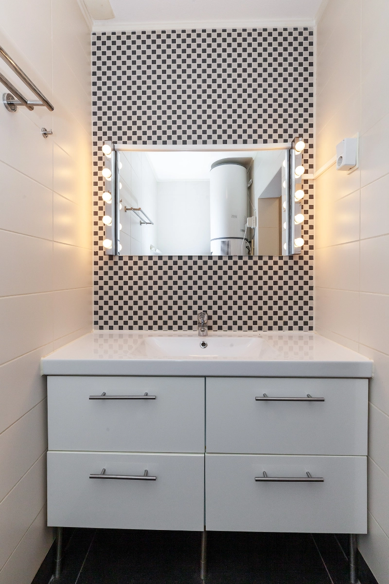 De badkamer is netjes afgewerkt met grijs- en crèmekleurige tegels en beschikt over een douchehoek, een modern badkamermeubel met vier laden en een spiegel met verlichting. Voor de warmwatervoorziening is een hybride boiler van 100 liter aanwezig.