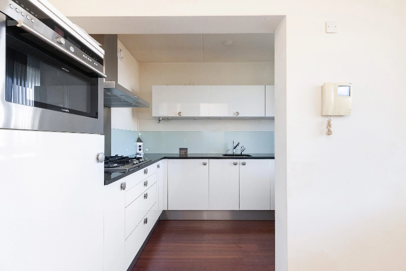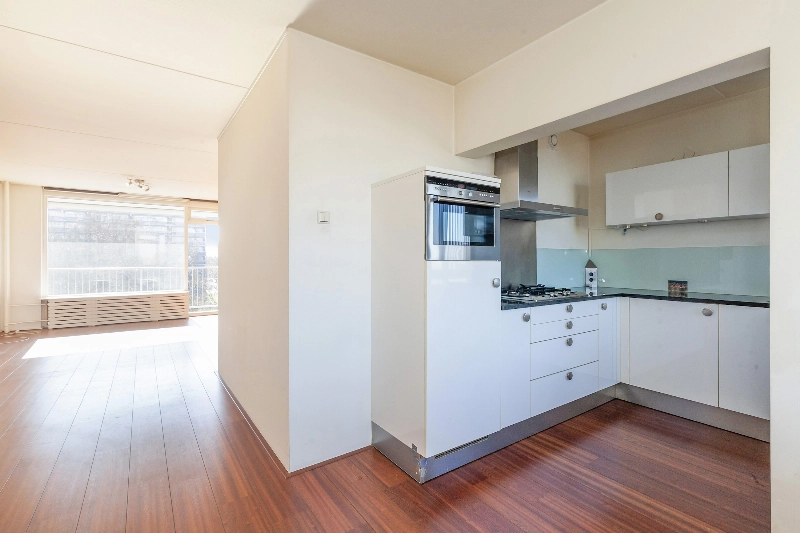 Entree, hal, garderobe en meterkast. Tussendeur naar de lichte woonkamer met toegang tot balkon, half open keuken met diverse inbouw apparatuur.