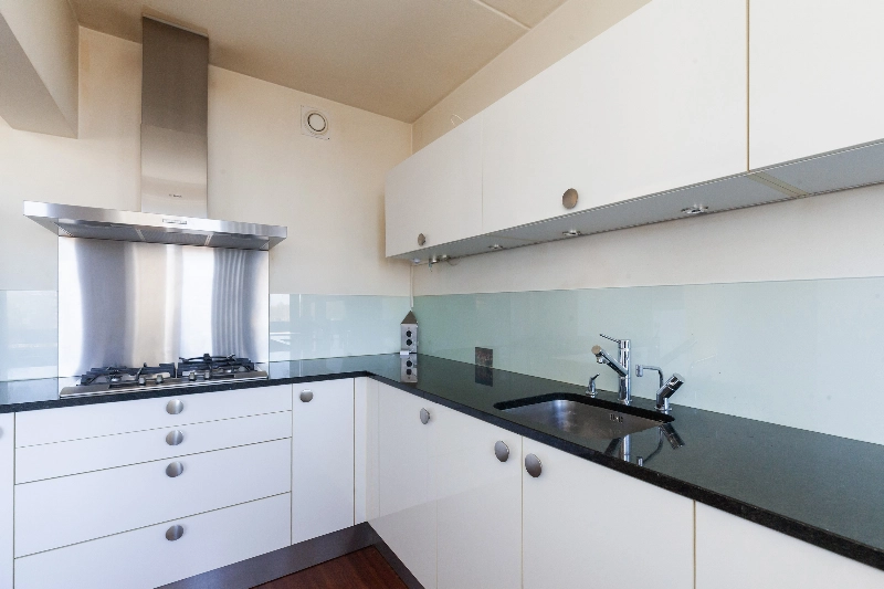 De keuken is ruim en praktisch ingericht in een hoekopstelling en uitgevoerd met witte zijdeglans kastfronten. De keuken is voorzien van diverse inbouwapparatuur, waaronder een combi-oven, koelkast, 4-pits gaskookplaat en een Quooker-kraan voor direct kokend water.