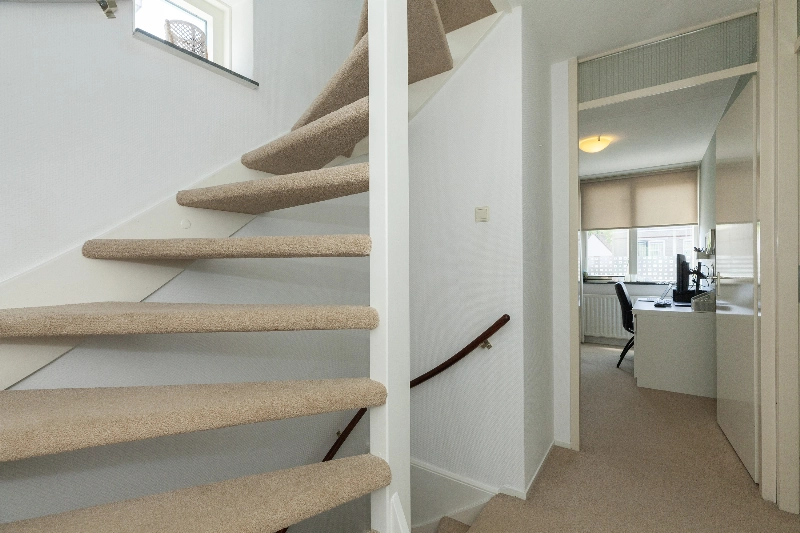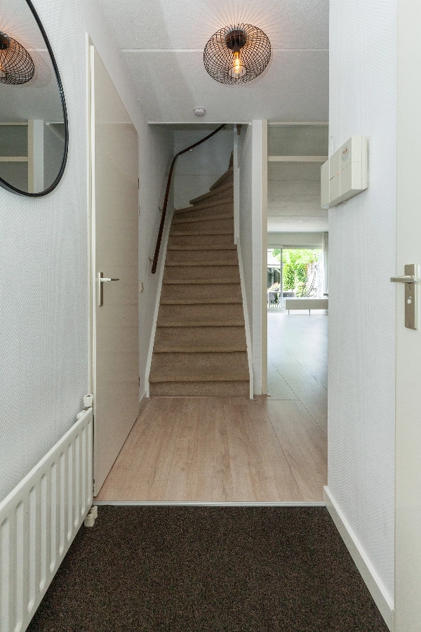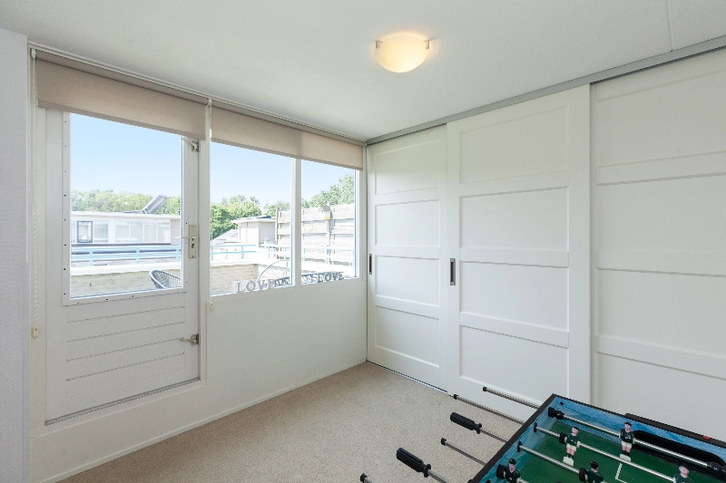 Op de tweede verdieping bevindt zich de overloop met extra aansluiting voor de wasmachine en droger. Hier vind je ook de CV en de omvormer voor de zonnepanelen. Deze zijn keurig weggewerkt achter een schuifkast.
