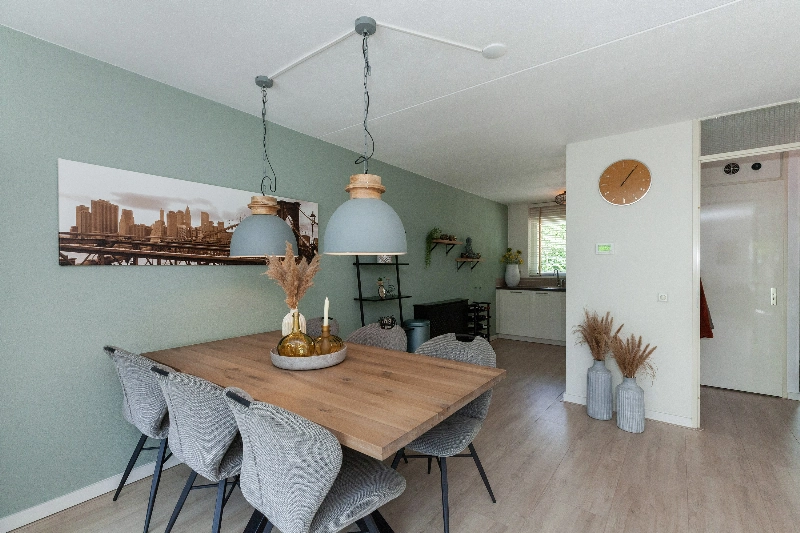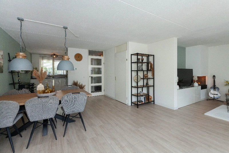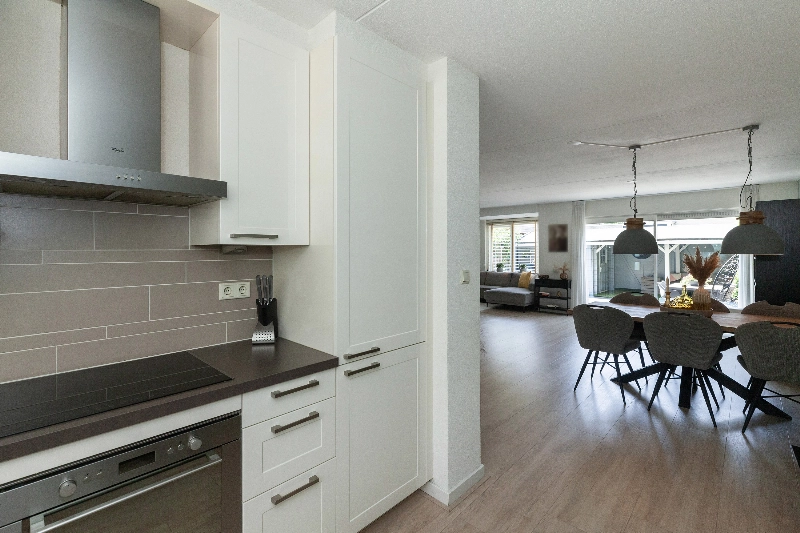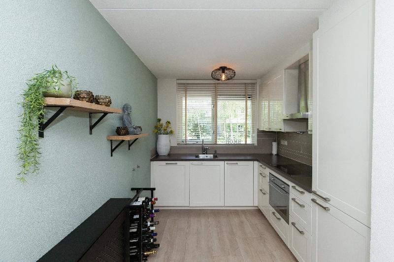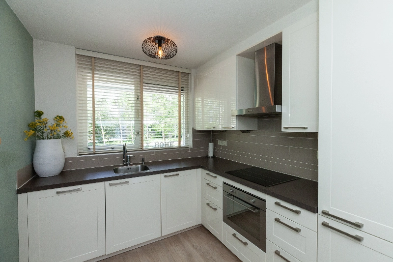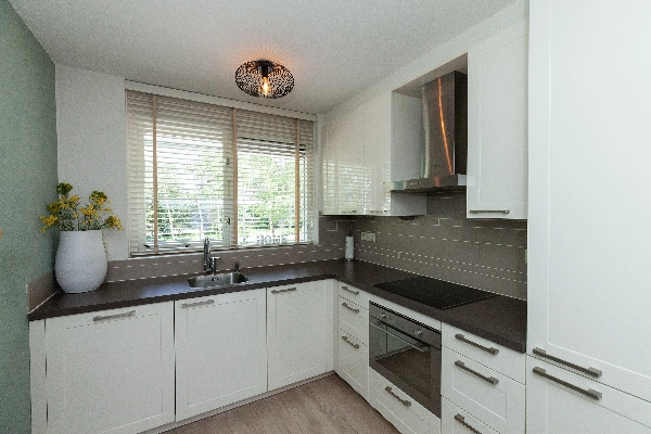 De open keuken aan de voorzijde biedt leuk zicht op de straat en het groen en is uitgerust met een grote hoekopstelling met moderne inbouwapparatuur zoals inductiekookplaat, afzuigkap, combi-oven, vaatwasser, koelkast en een vriezer. De keukenkastjes zijn in 2023 overgespoten en zien er helemaal strak uit.