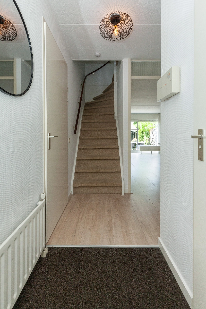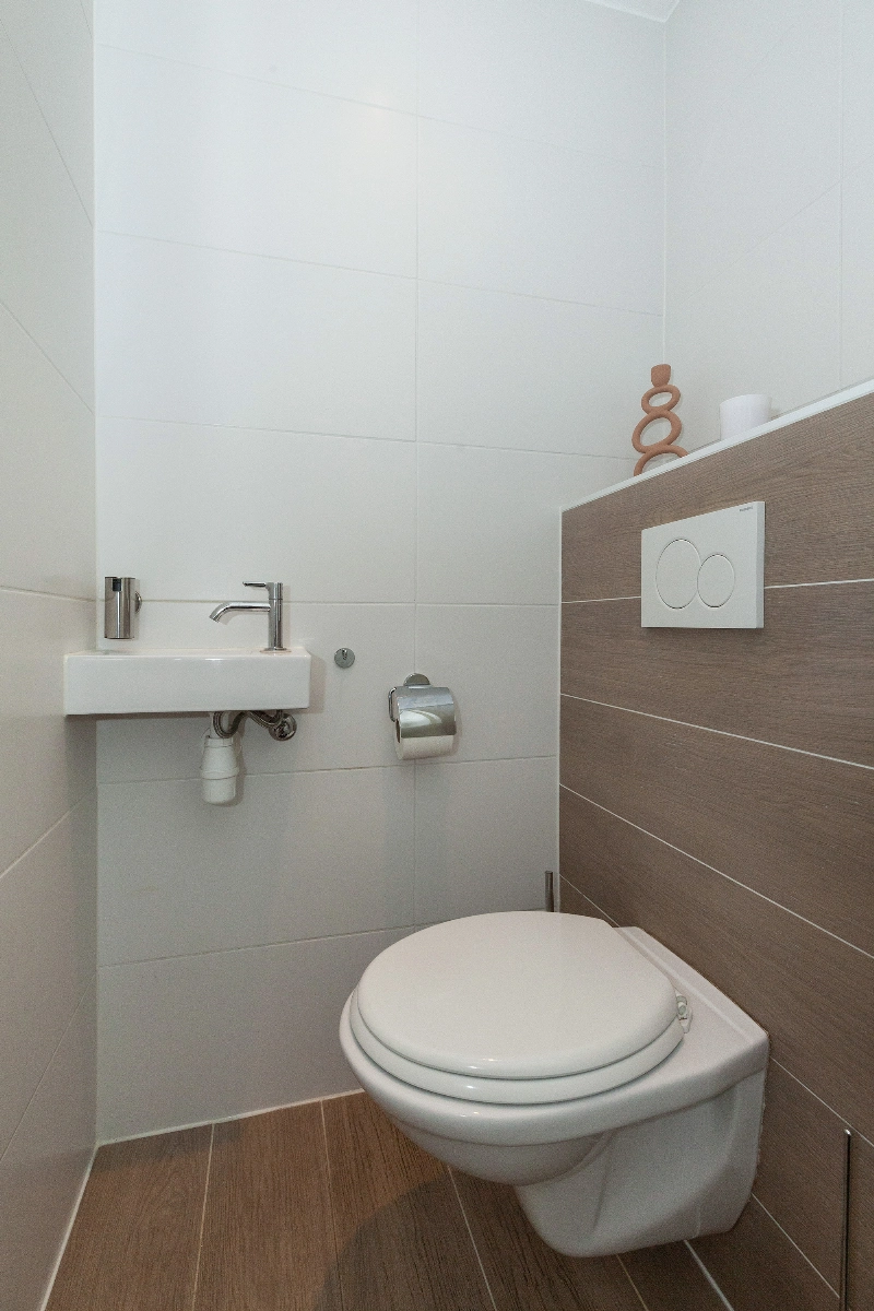 Binnenkomst in de hal met meterkast en modern afgewerkte toiletruimte, voorzien van houtlook tegels en witte wandtegels, zwevend toilet en fonteintje. Vanuit de hal is er toegang tot de garage, de woonkamer en er is een trap naar de eerste verdieping.