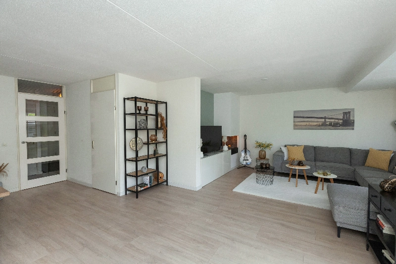 En dan die woonkamer… wat een prachtige ruimte! Deze tuingerichte kamer is voorzien van een moderne laminaatvloer, uitgevoerd in brede eikenlook planken en strakke wandafwerking. De trapkast zorgt voor extra bergruimte en de ruime, sfeervolle zithoek met vaste sfeerhaard en een schuifpui naar de zonnige achtertuin maakt het plaatje compleet! Ruimte genoeg voor een groot gezin!