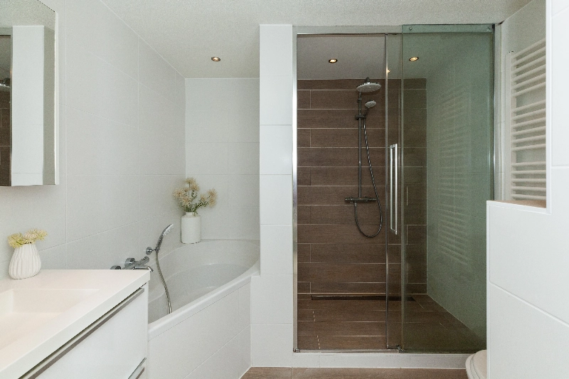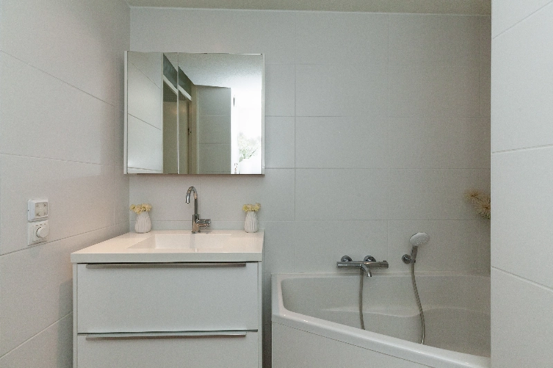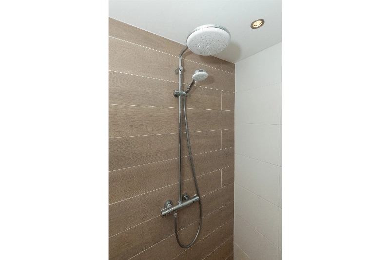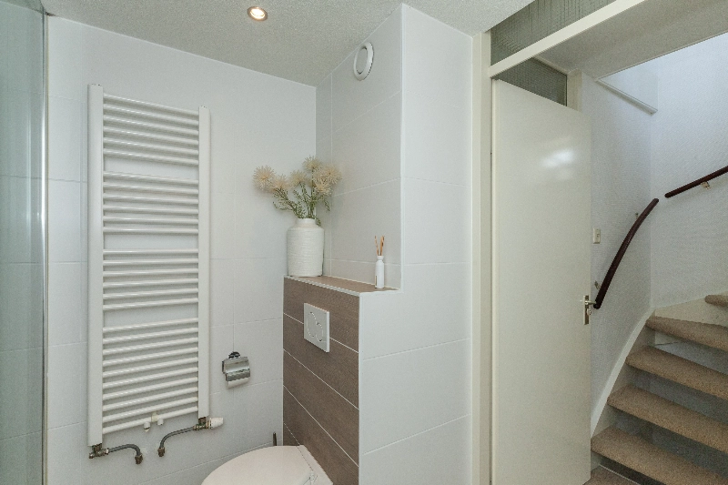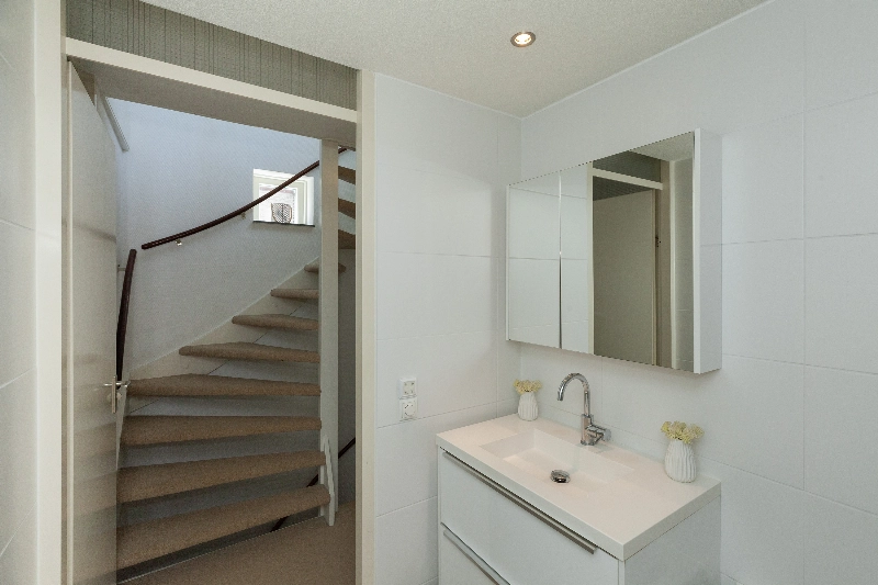 De moderne badkamer is ruim van opzet en is uitgerust met een hoekligbad, grote inloopdouche met glazen scherm, 2e toilet, handdoekenradiator en een wastafelmeubel met spiegelkast. De mechanische ventilatie is vernieuwd en de betegeling is uitgevoerd in wit en houtlook.