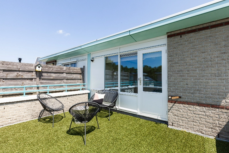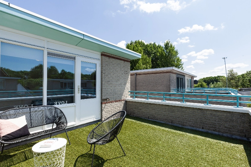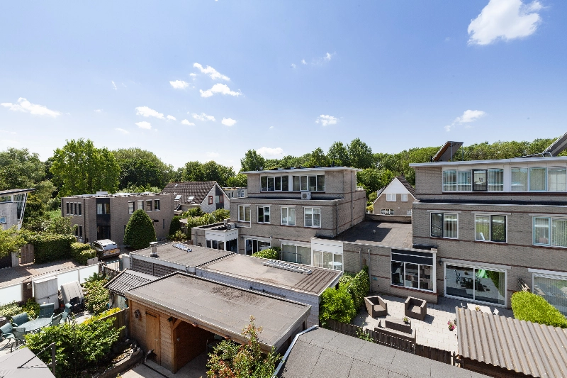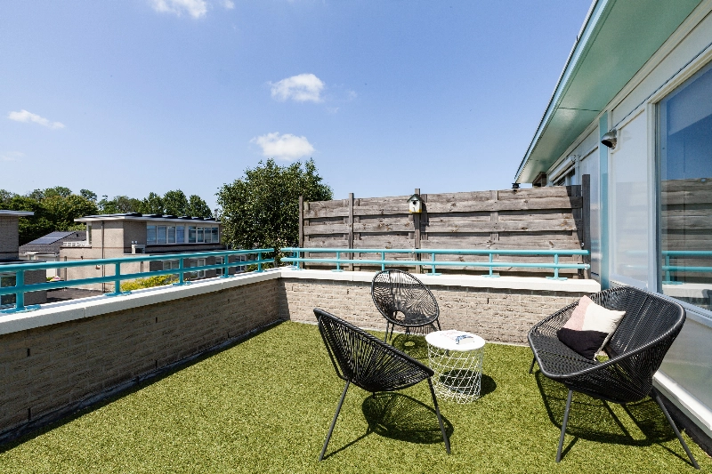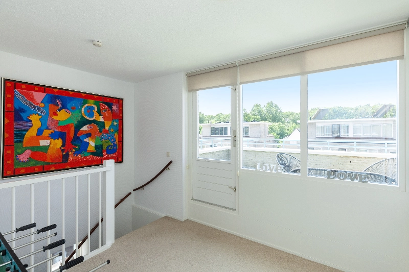 Via de overloop heb je toegang tot het ruime en zonnige dakterras op het zuiden – een heerlijke plek om van de zon te genieten, de hele dag door.