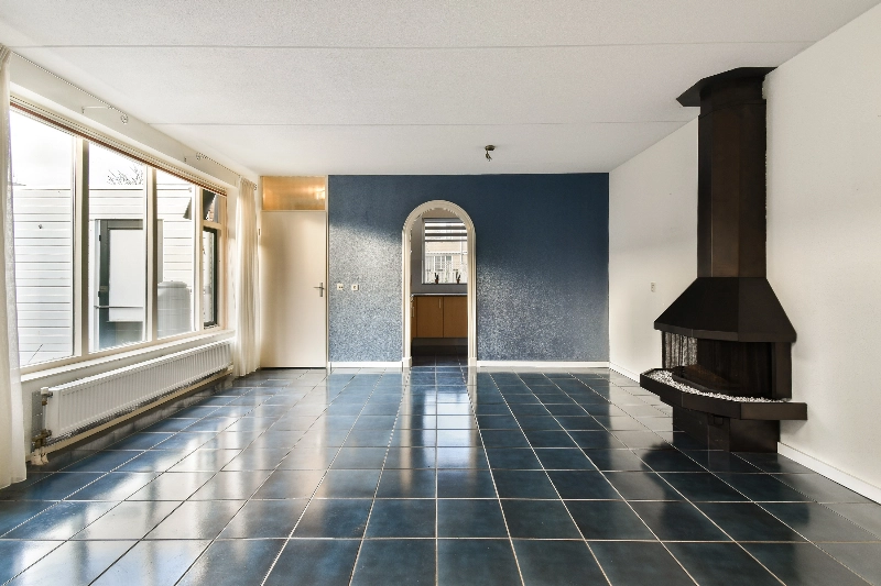 De ruime woonkamer met een afmeting van ca. 4.81 x 5.27/8.06m is voorzien een plavuizenvloer en spachtelputz wanden, door de grote raampartijen is er een mooie lichtinval en de sfeervolle hout gestookte open haard maakt de sfeer volledig af.