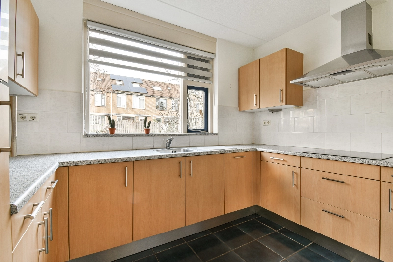 De semi-open keuken is voorzien van een plavuizen vloer en een U-vormig keukenblok voorzien van diverse inbouwapparatuur zoals koelkast, oven, inductiekookplaat, afzuigkap en vaatwasser.
