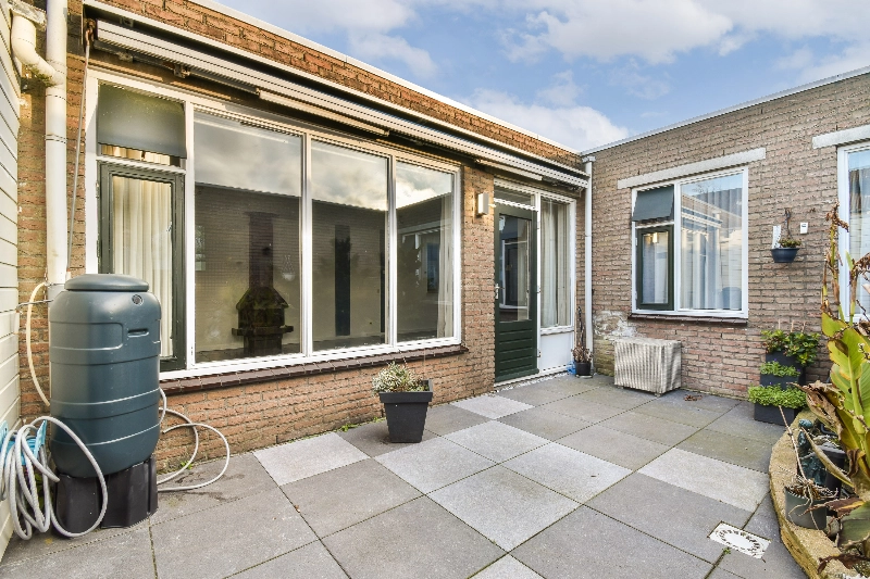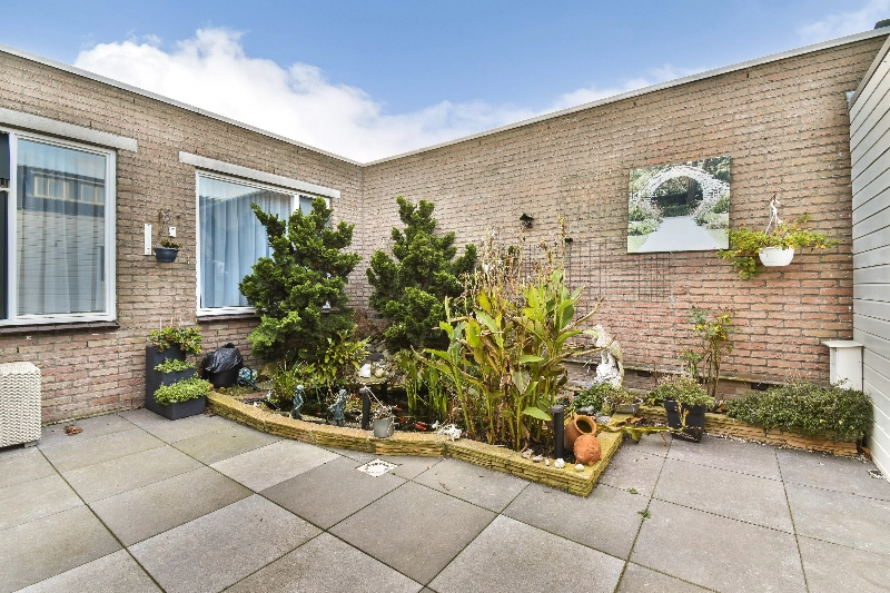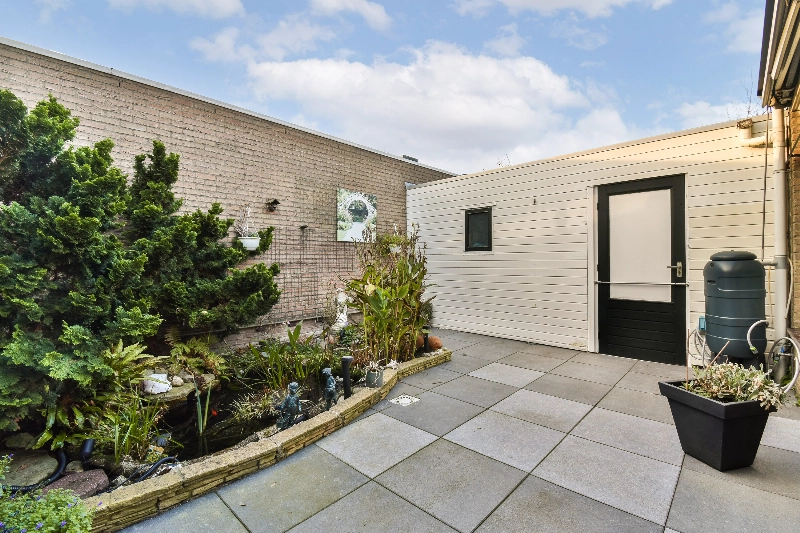Geniet in alle rust en privacy van de patio-tuin. De praktische berging is te bereiken via de tuin aan de voorzijde.