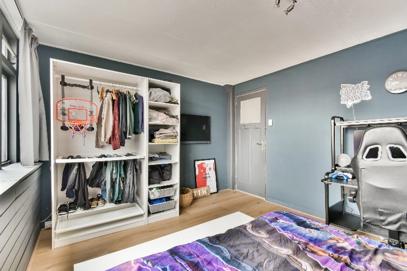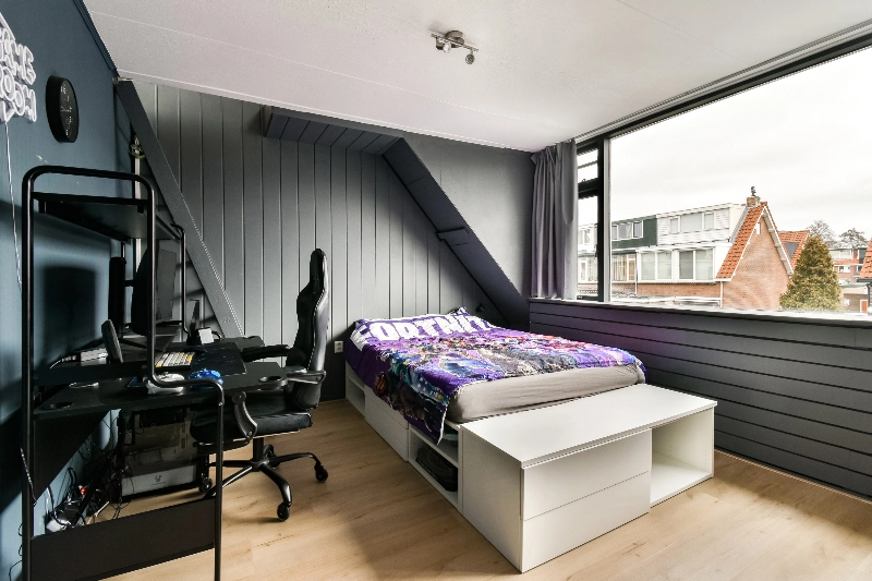 De zolderkamer heeft ook een groot kunststof dakkapel en er is veel bergruimte achter de schotten. Een heerlijke ruimte om te gebruiken voor werk- of hobbyruimte!