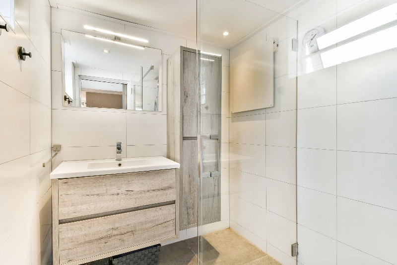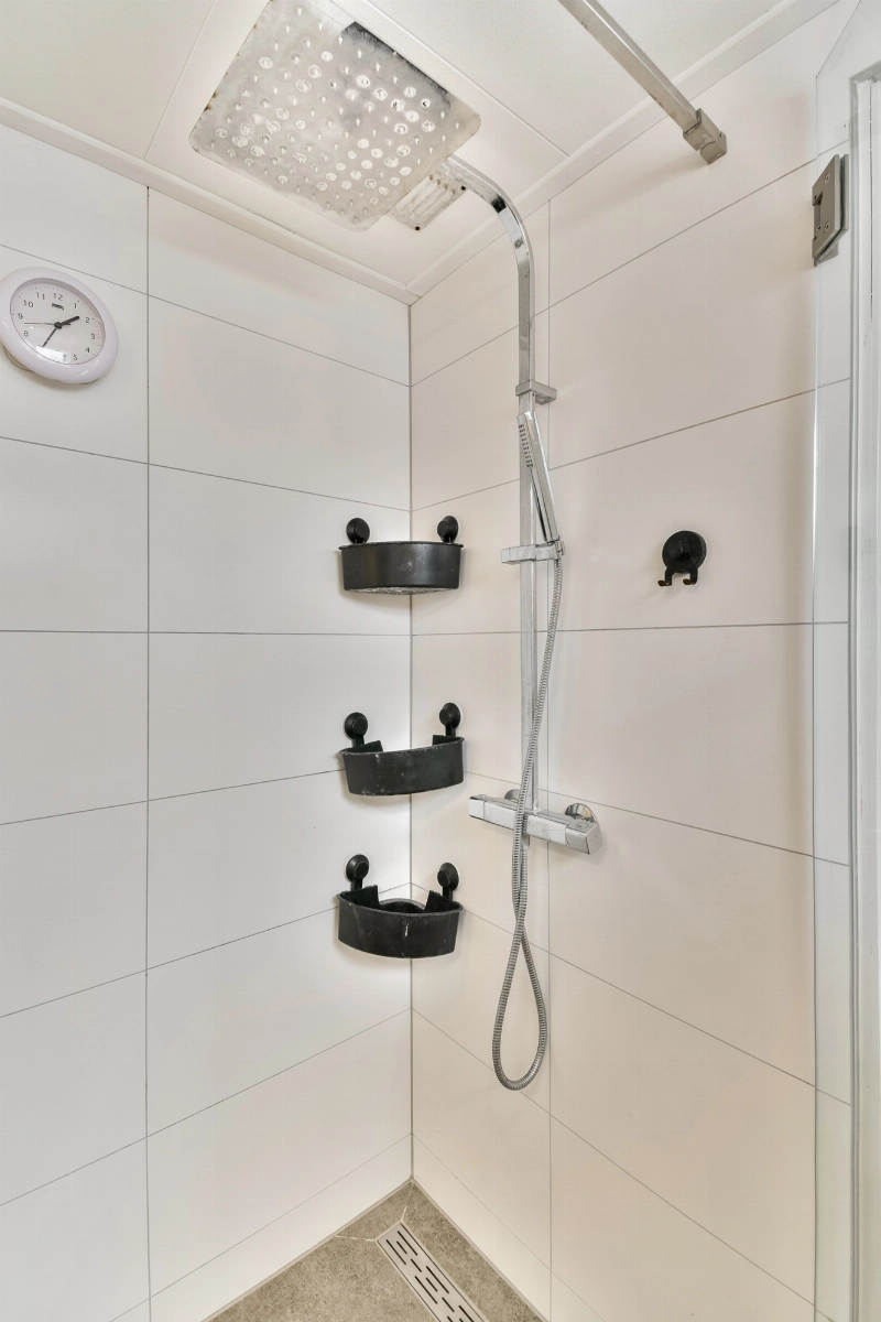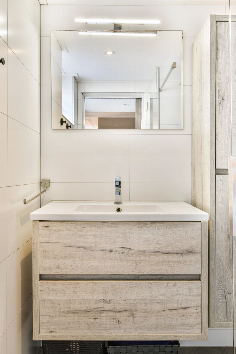 Via de hippe steigerhouten schuifdeur bereik je de moderne badkamer. Deze is in 2018 nieuw geplaatst en voorzien van witte wand- en zachtgrijze vloertegels, een inloopdouche en wastafelmeubel met kast en een verlaagd plafond met spots.