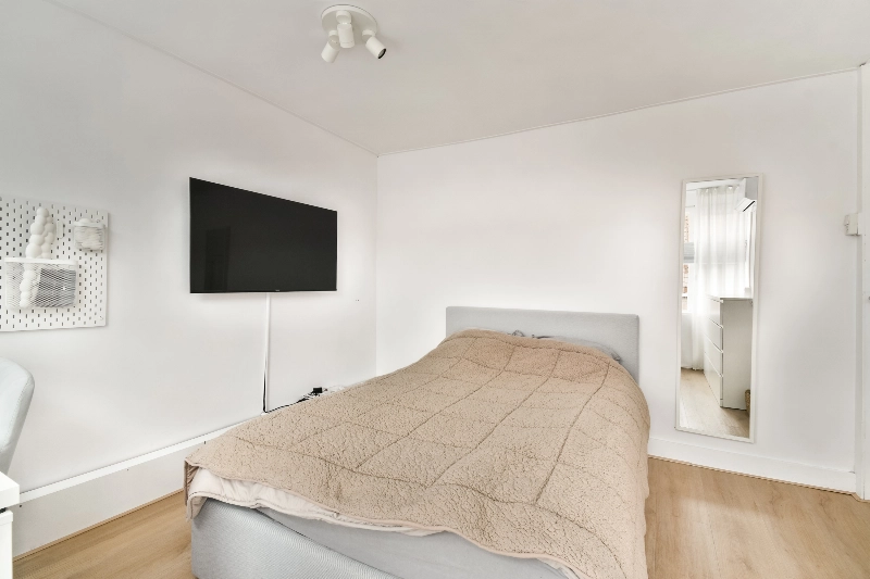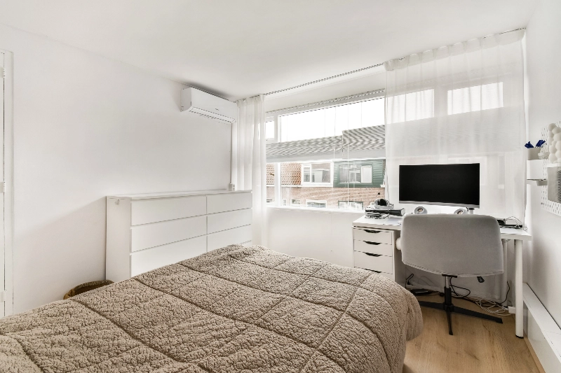 Aan de voorzijde is een ruime slaapkamer met gestucte wanden en plafond. Het grote raam is in 2019 vervangen en er is in 2025 een split-airco geplaatst waarmee je kunt koelen en verwarmen.