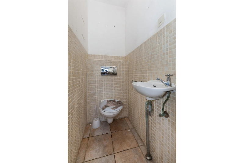 Entree, hal met meterkast (6 groepen) en plavuizen vloer welke doorloopt naar de woonkamer. Moderne toiletruimte met mozaïek wandtegels, zwevend toilet en fonteintje.