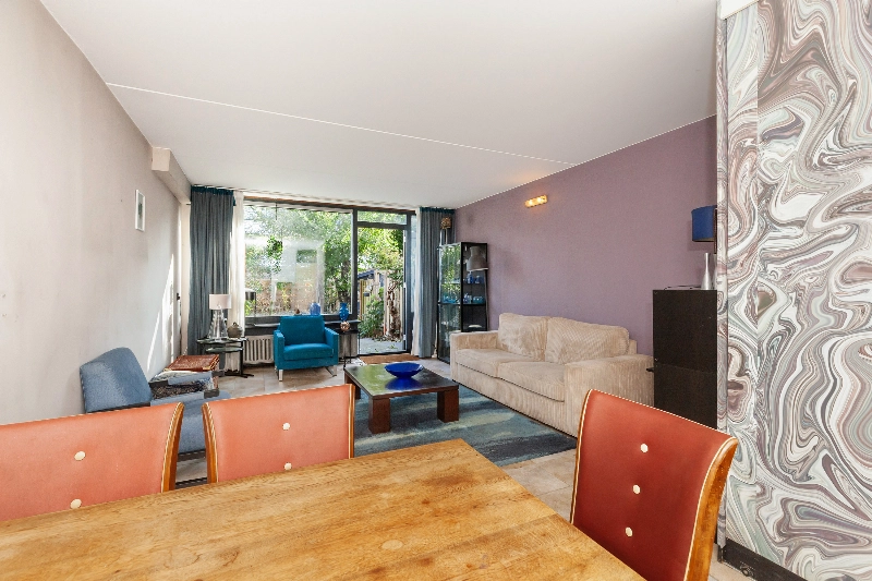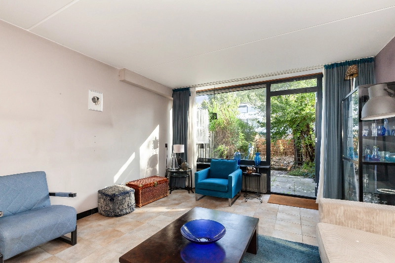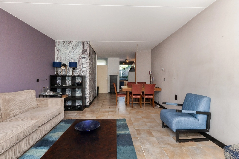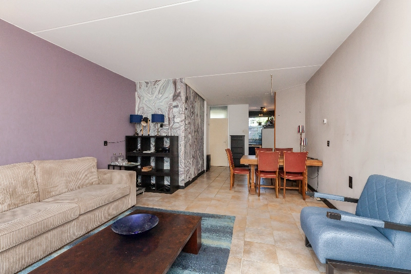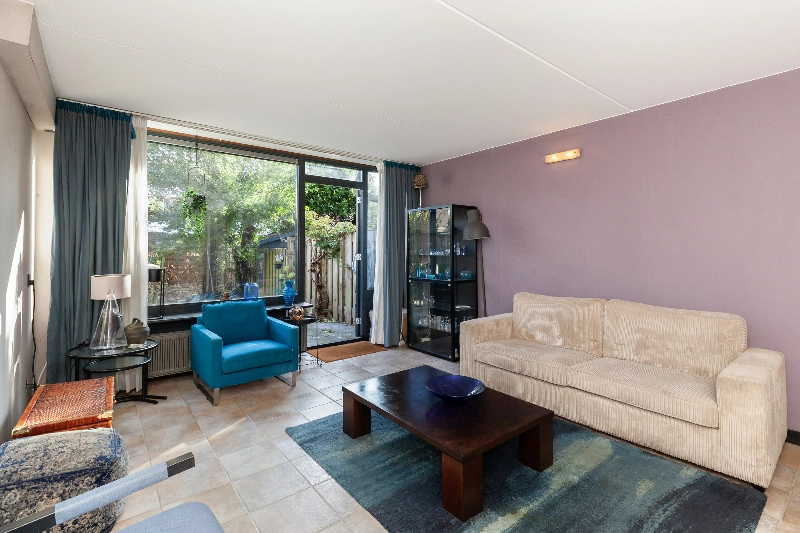 Tuingerichte woonkamer met een gladde wandafwerking, trapkast en open keuken.