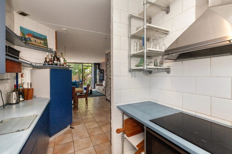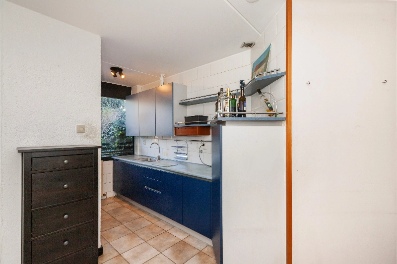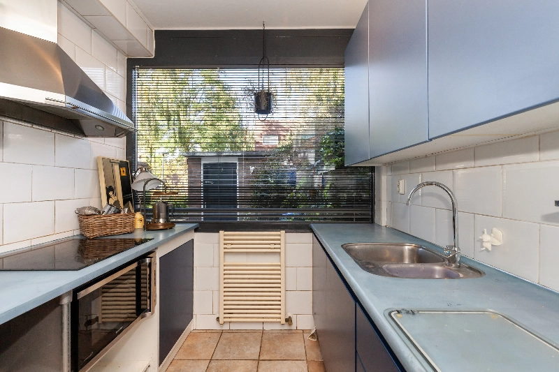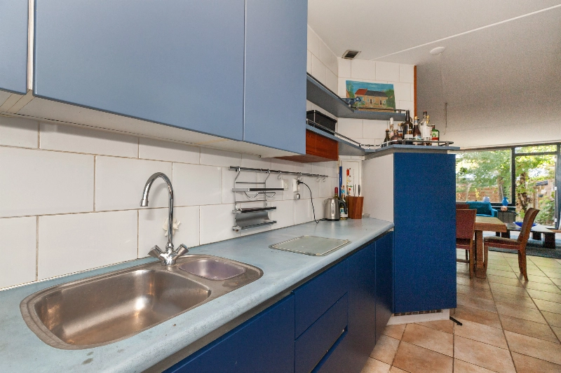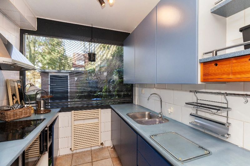 Aan de voorzijde van de woning bevindt zich de open keuken met blauwe fronten en kunststof aanrechtblad. De keuken is voorzien van een inductie kookplaat met RVS afzuigkap, koelkast en een vaatwasmachine.