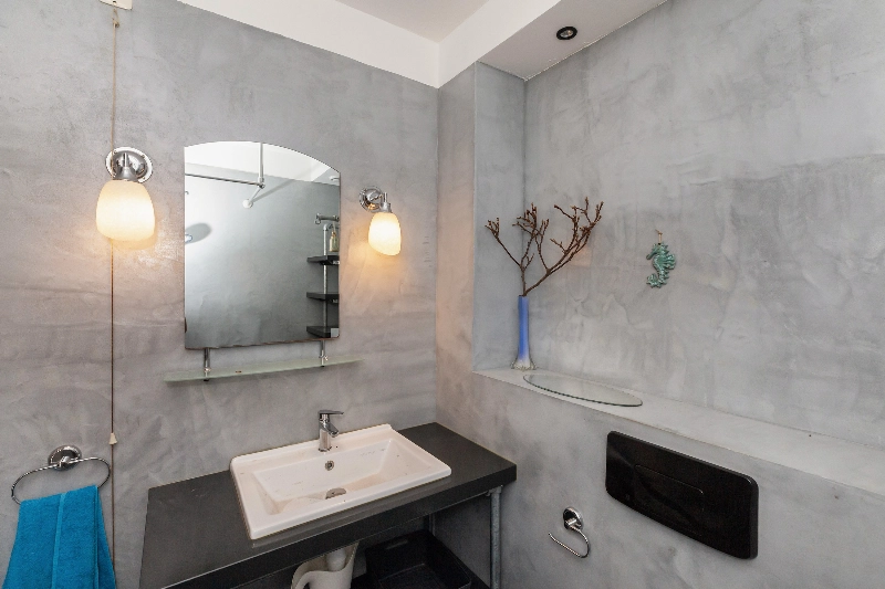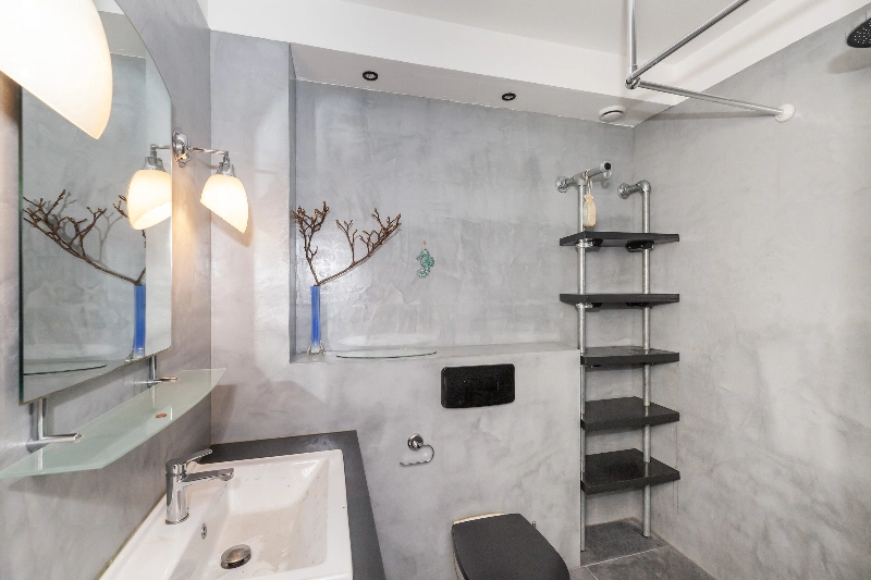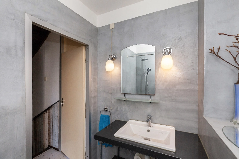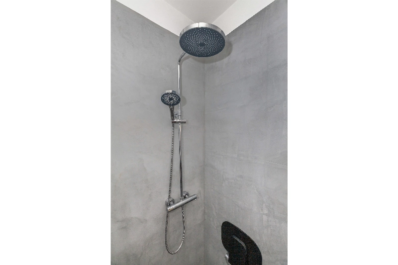 Moderne badkamer met beton ciré wanden, antracietgrijze vloertegels, douchehoek met regendouche én handdouche, zwevend toilet en moderne witte wastafel met spiegel, planchet en verlichting.