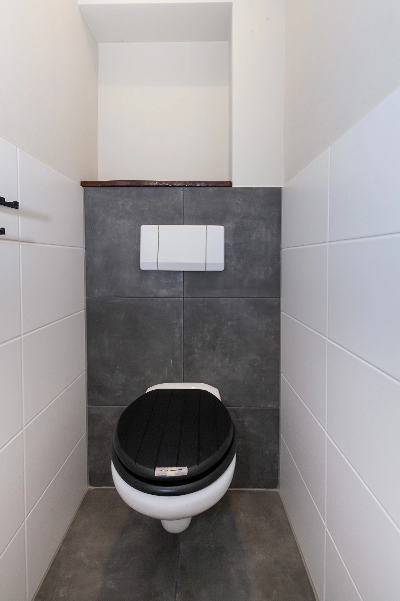 Entree, ruime hal met meterkast (5 groepen, aardlekschakelaars en een hoofschakelaar) en moderne toiletruimte met witte en antraciet betegeling en een zwevend toilet.