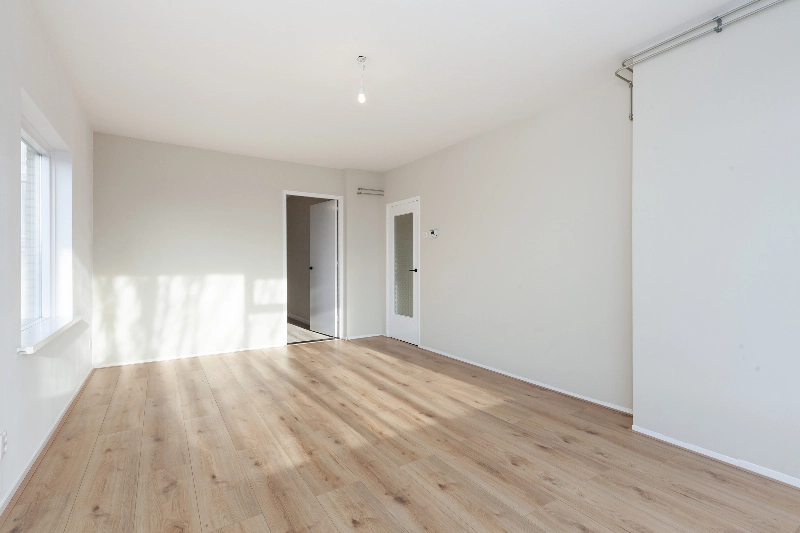 Ruime en lichte woonkamer met een grote raampartij en een extra zijraam. Op de vloer ligt een nieuwe houtlook laminaatvloer, welke doorloopt naar de gang.