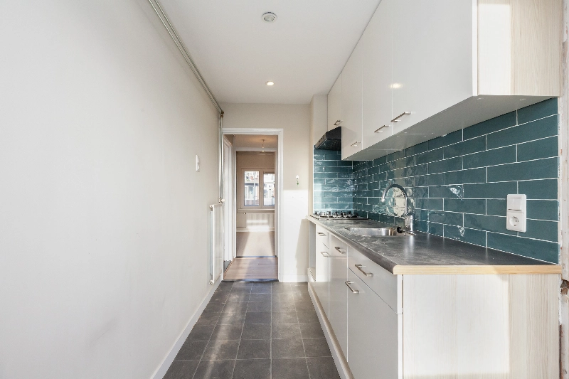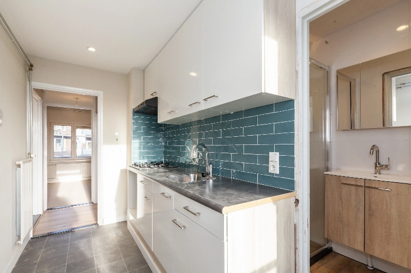 Moderne keuken in een witte opstelling met een antraciet aanrechtblad, een 4-pits gas-op-glas kookplaat en een zwarte afzuigkap. De achterwand is afgewerkt met stijlvolle groen/blauwe metrotegels. Direct aan de keuken grenst een klein balkon.