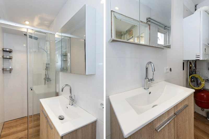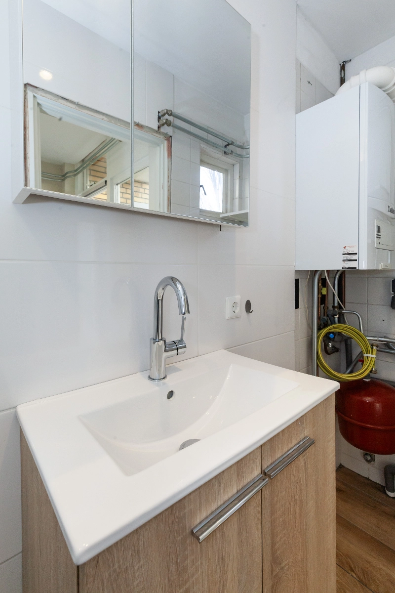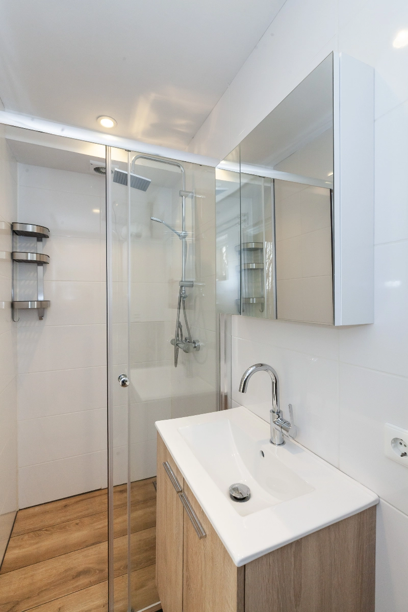 Vanuit de keuken bereik je de badkamer, volledig betegeld met grote witte wandtegels en een houtlook vloer. De badkamer beschikt over een ruime inloopdouche met stortdouche, draingoot en glazen schuifwand, een modern wastafelmeubel met spiegelkast. Tevens bevindt zich in de badkamer de opstelling van de c.v. combiketel (Vaillant).