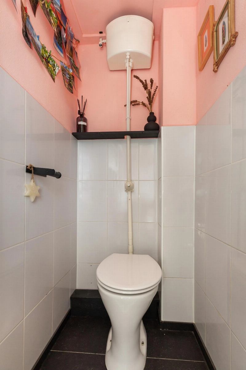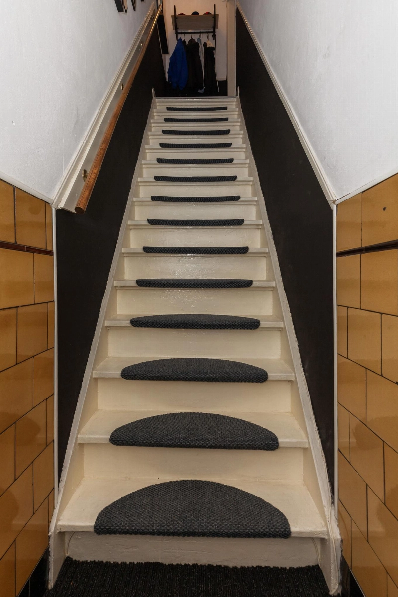Via het open portiek bereik je op de 1e verdieping de voordeur met trap naar de 2e verdieping. De entreehal is voorzien van de originele, sfeervolle wandbetegeling. Eenmaal boven bereik je de woonkamer. Dit is een fijne, ruime plek met veel daglicht en voldoende plek voor een grote eettafel en ruime zithoek. De woonkamer is voorzien van een laminaatvloer en er is een deur naar een ruime bergkast. Aan de achterzijde vind je een toiletruimte met gedeeltelijke betegeling en een staand closet.