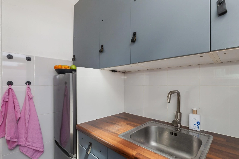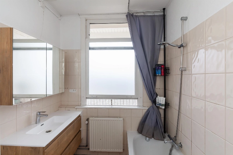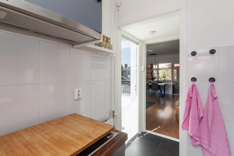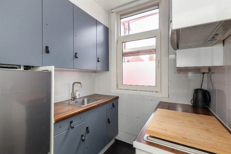 De keuken is voorzien van een eenvoudige, maar keurig nette opstelling aan beide zijden. Je vindt hier een afzuigvlakscherm, 4 pits gaskookplaat en een oven. In de keuken hangt ook de CV-ketel en er is een deur naar het balkon.