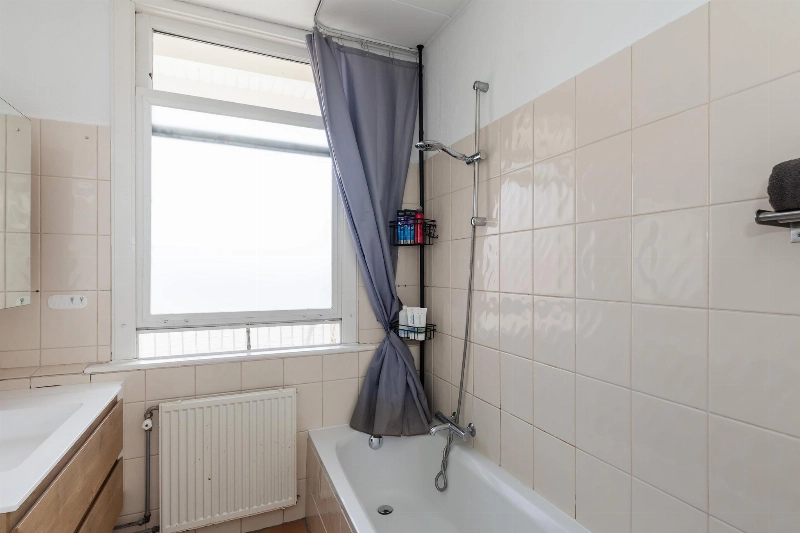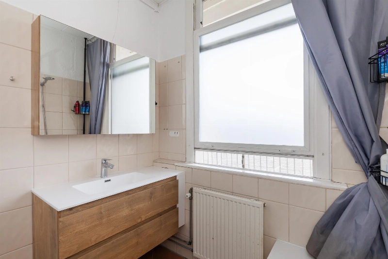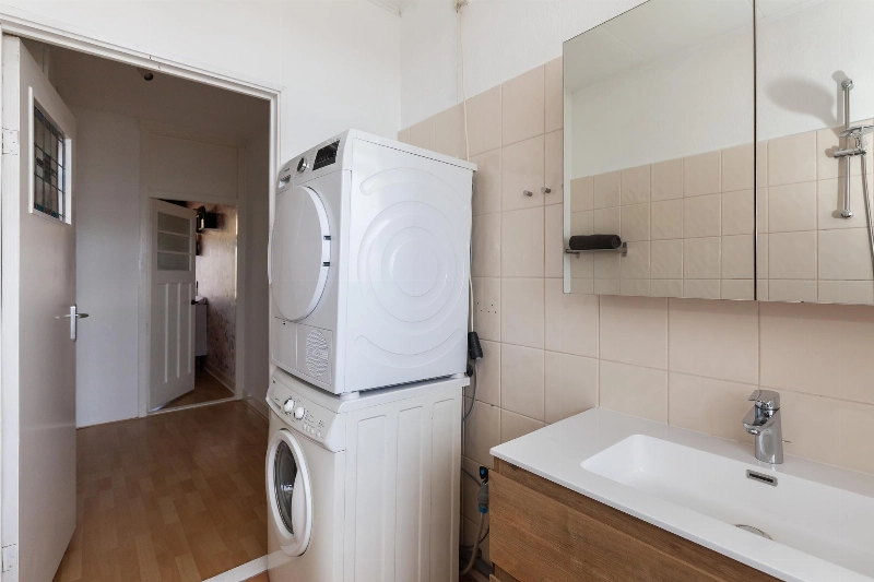 Aan de achterzijde, in een voormalige 3e slaapkamer, is de badkamer geplaatst. Deze is gedeeltelijk betegeld en uitgevoerd met een ligbad met doucheopstelling, een wastafelmeubel met bovenkastje en aansluiting van de wasmachine en droger.