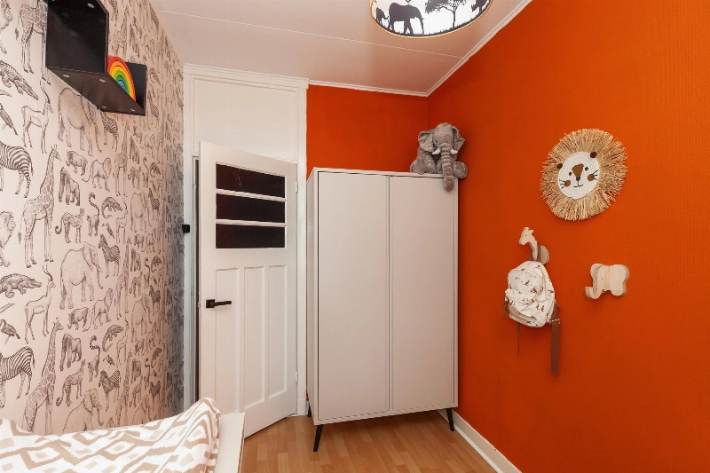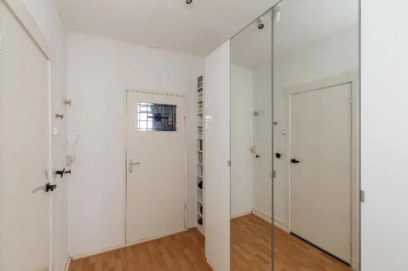 We gaan weer terug naar de woonkamer en via een tussenhal bereik je de 2e slaapkamer. Deze ligt aan de voorzijde en is voorzien van een laminaatvloer.
