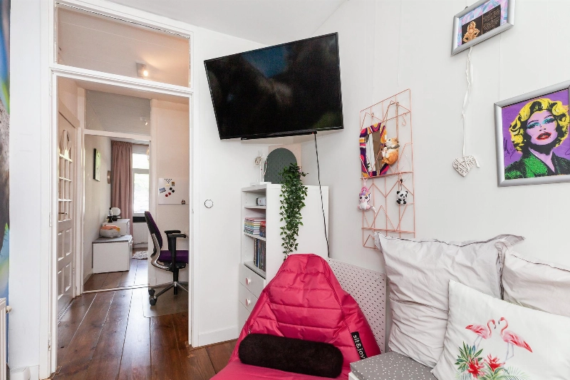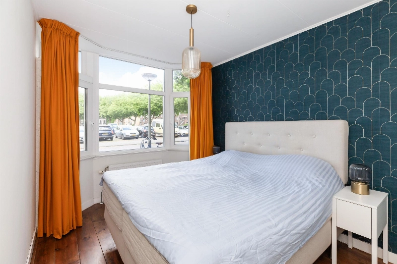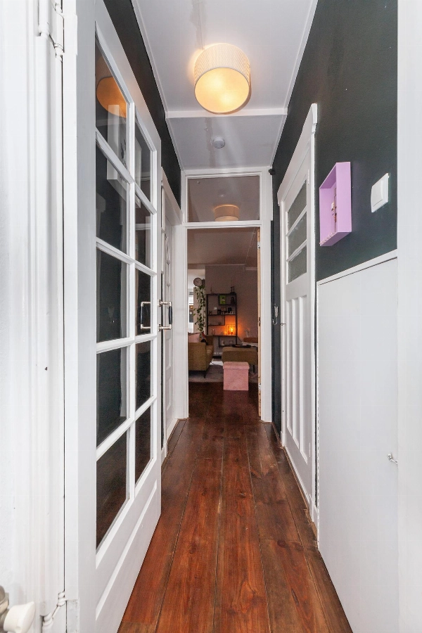 Entree, vestibule met originele terrazzovloer. In de hal ligt een houten vloer welke doorloopt in de gehele woning. Hier is ook de meterkast, een kelderkast en doorgang naar slaapkamer I. Deze slaapkamer is gelegen aan de voorzijde en is voorzien van een sfeervolle erker met kunststof ramen met triple glas.