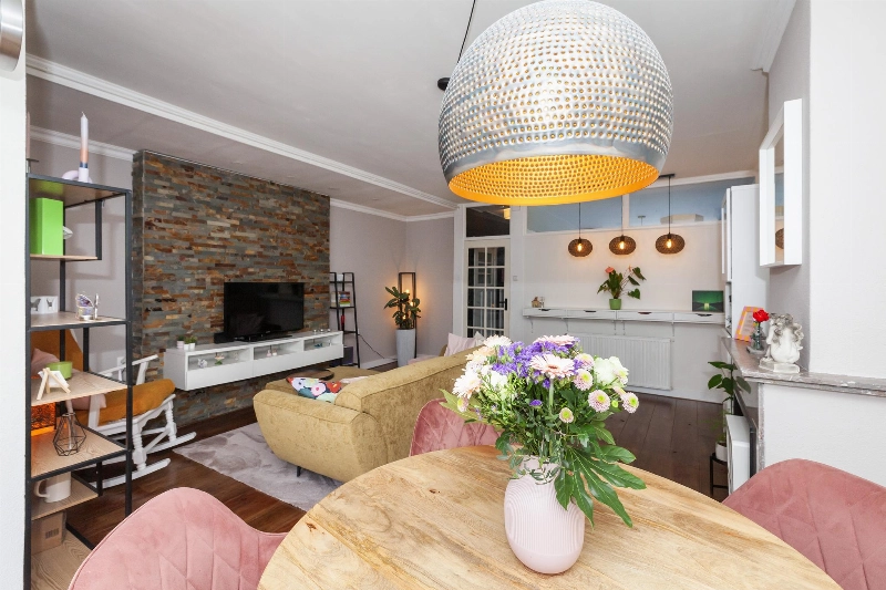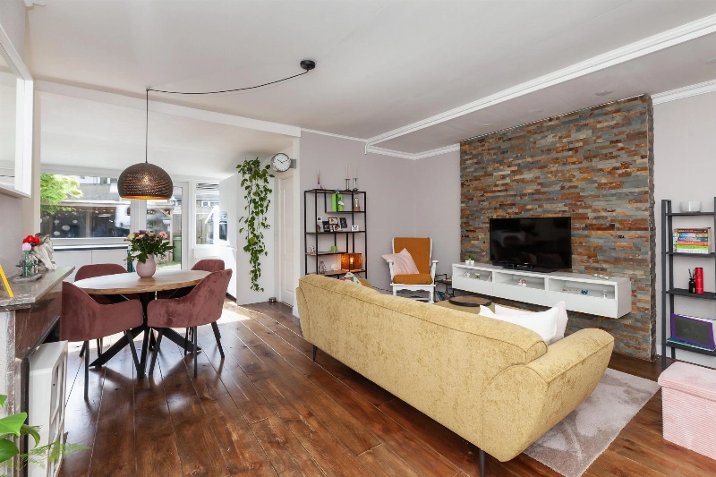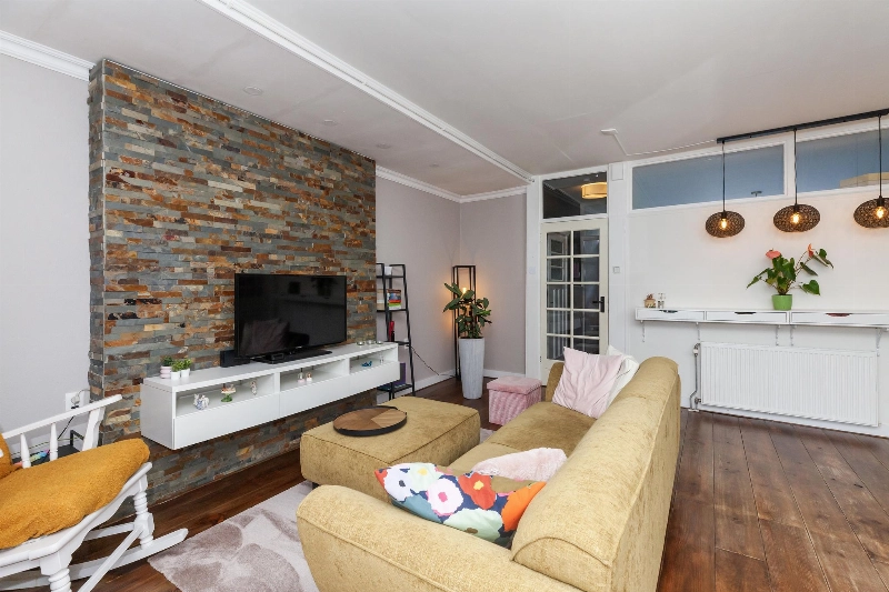 We lopen vanuit de hal door naar de woonkamer. Deze kamer is zeer ruim en licht! Er is genoeg ruimte voor een gezellige zithoek waarvan de wand achter de televisie is afgewerkt met natuursteen steenstrip. De overige wanden zijn strak afgewerkt.