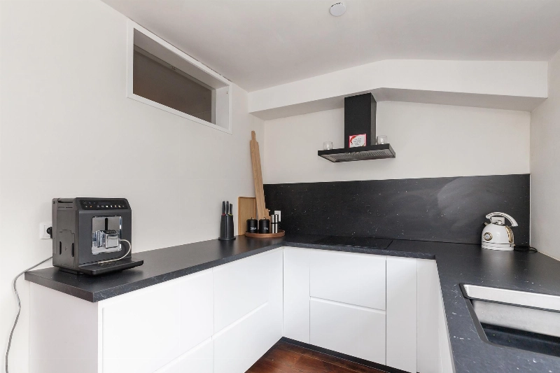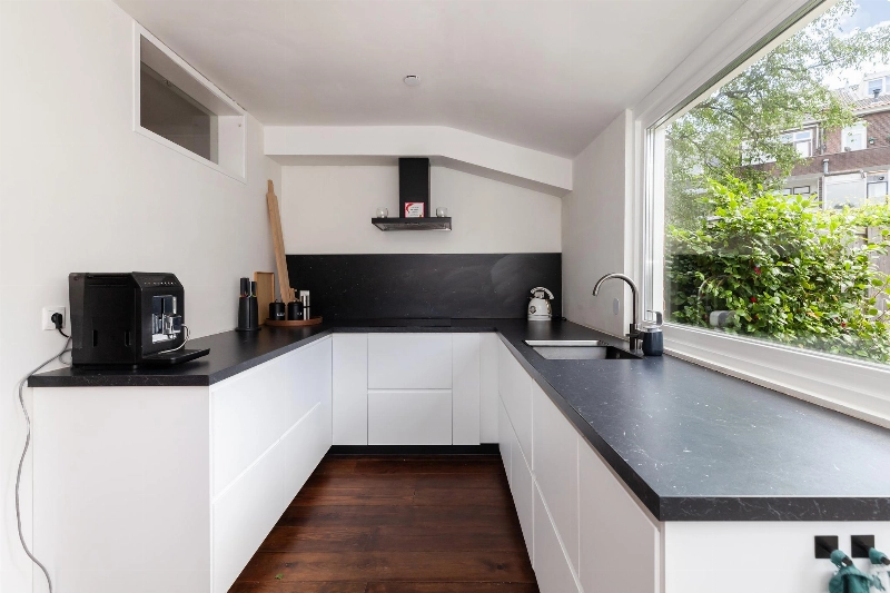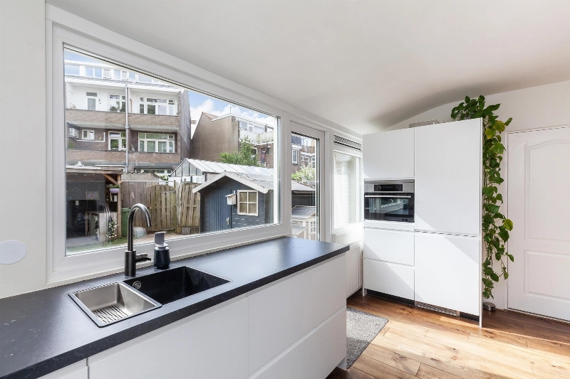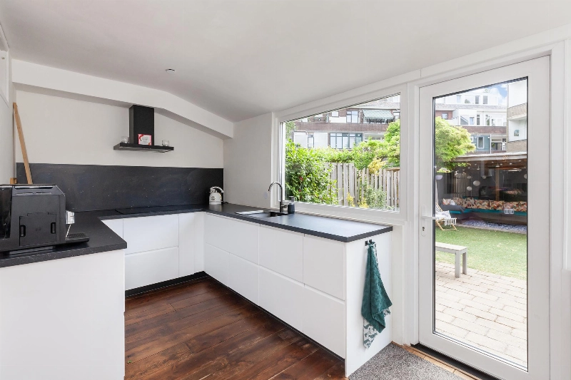 De woning is aan de achterzijde uitgebouwd en in deze uitbouw is de open keuken geplaatst. De keuken is in 2023 nieuw geplaatst en is voorzien van een mat witte U-opstelling met zwart kunststof aanrechtblad en voorzien van vaatwasser, veel kastruimte, inductiekookplaat en een afzuigkap. De hoge opstelling aan de andere muur is voorzien van een koelkast, vriezer en een combi-oven. Meer dan genoeg ruimte in deze keuken van waaruit je ook nog eens leuk de tuin in kijkt!