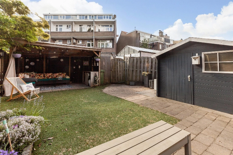 De diepe en brede tuin is op het zuidoosten gelegen en is voorzien van bestrating, groen, een overkapping van 12 m², achterom en een (oude) houten berging van 4m².