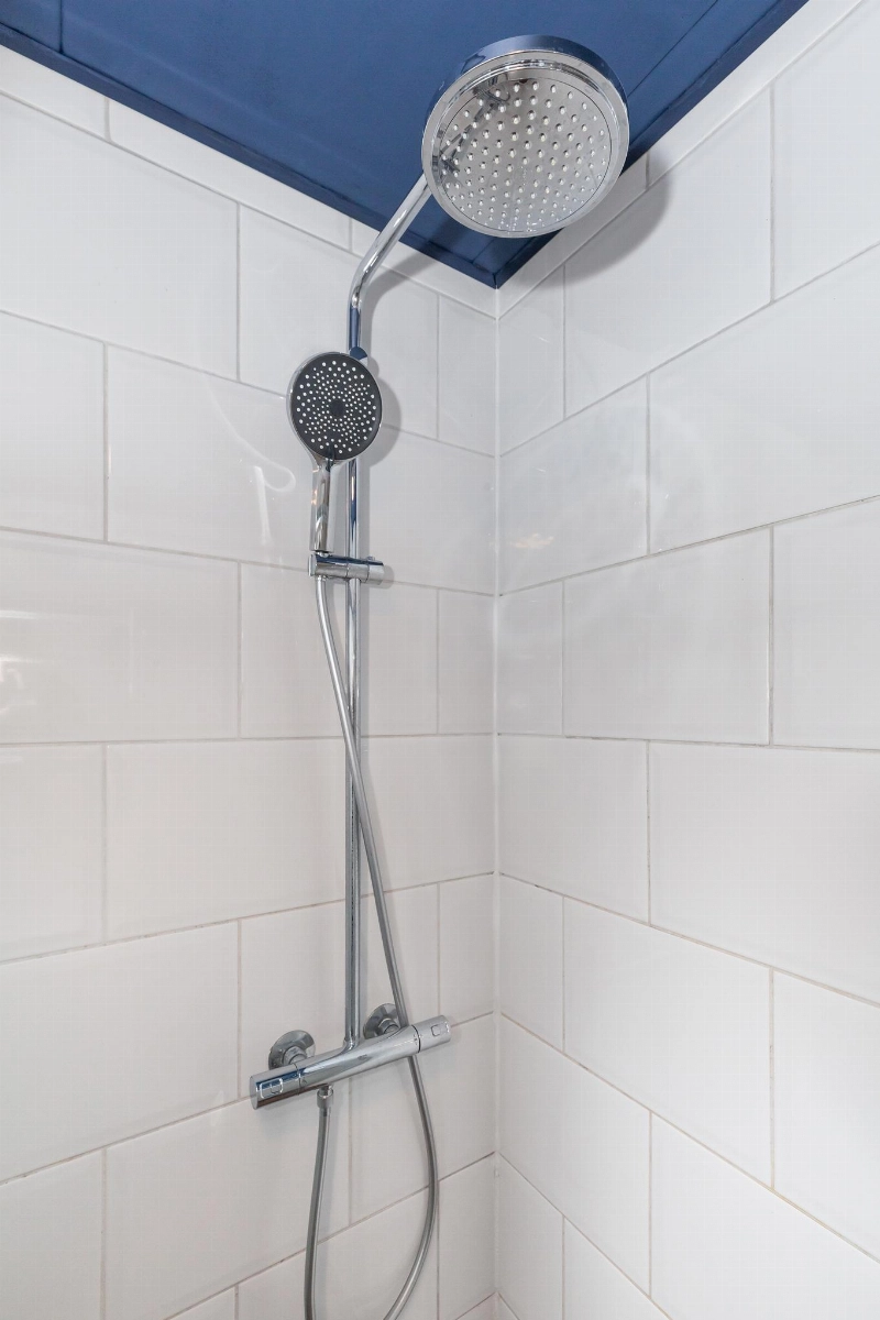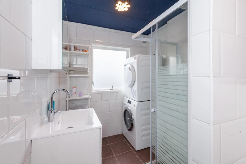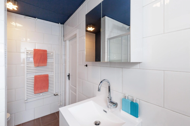 In de uitbouw is tevens de badkamer gesitueerd, welke voorzien is van bruine vloer- en grote witte wandtegels, een toilet, douchehoek (2022), wastafelmeubel met spiegel, aansluiting voor de wasmachine en droger en CV-ketel (2020).