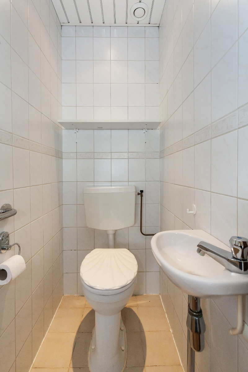 Geheel betegeld toilet met duoblok en een fontein.