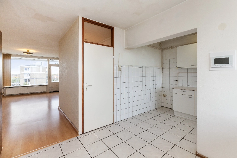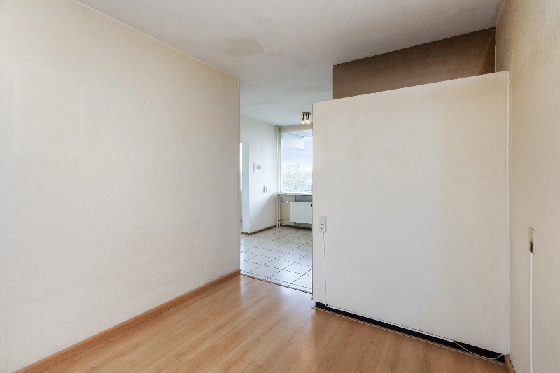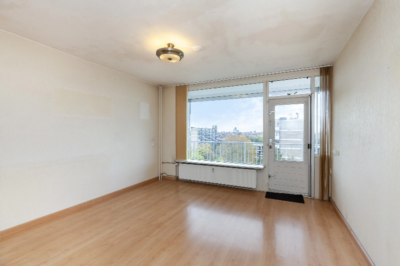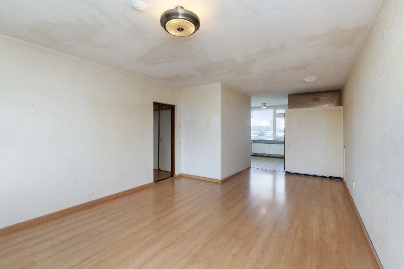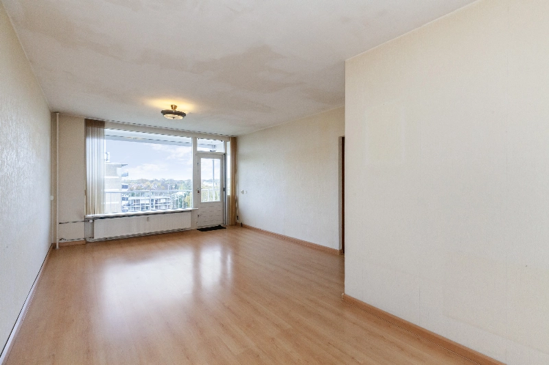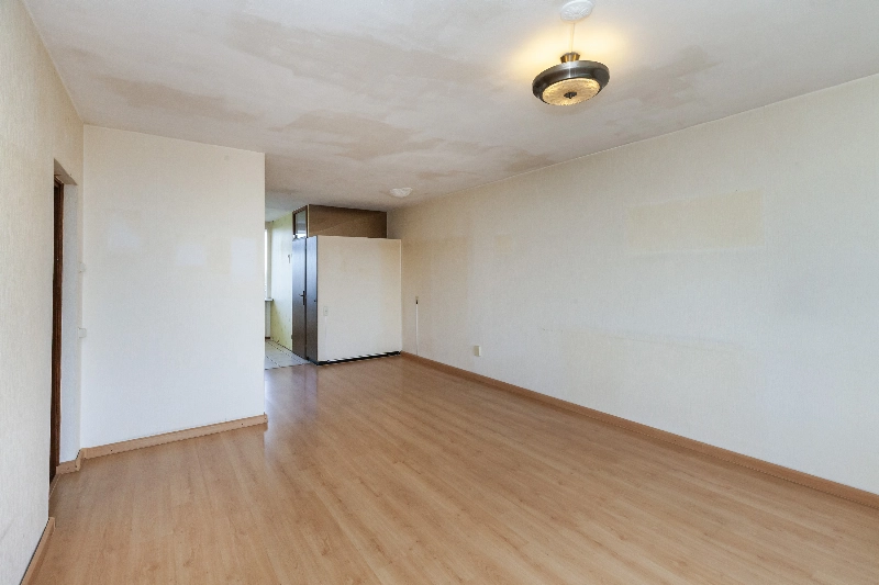 Tussendeur naar de ruime en lichte woonkamer van circa 33 m² voorzien van laminaat en met toegang tot het brede en zonnige balkon van circa 13 m² gelegen op het zuidwesten. Aan de voorzijde ligt de half open keuken met eenvoudige rechte opstelling met witte frontjes.
