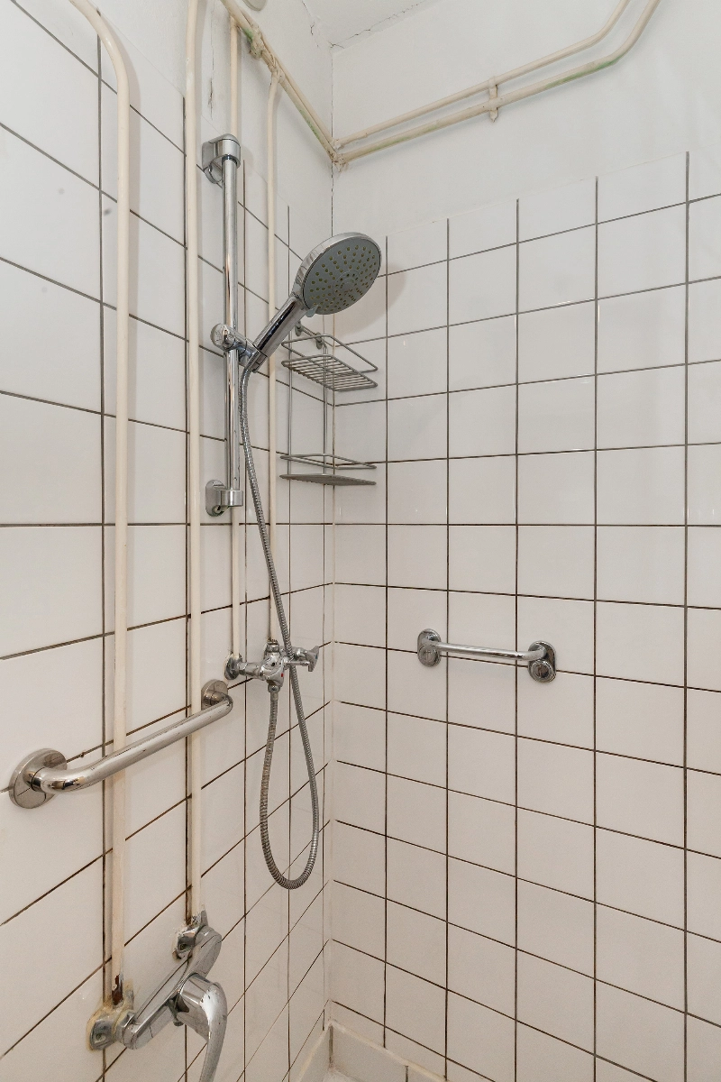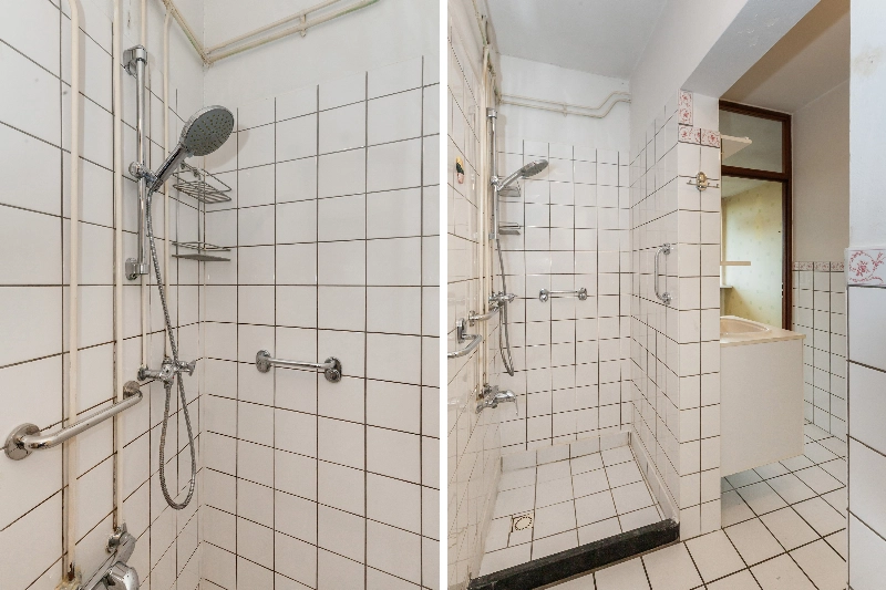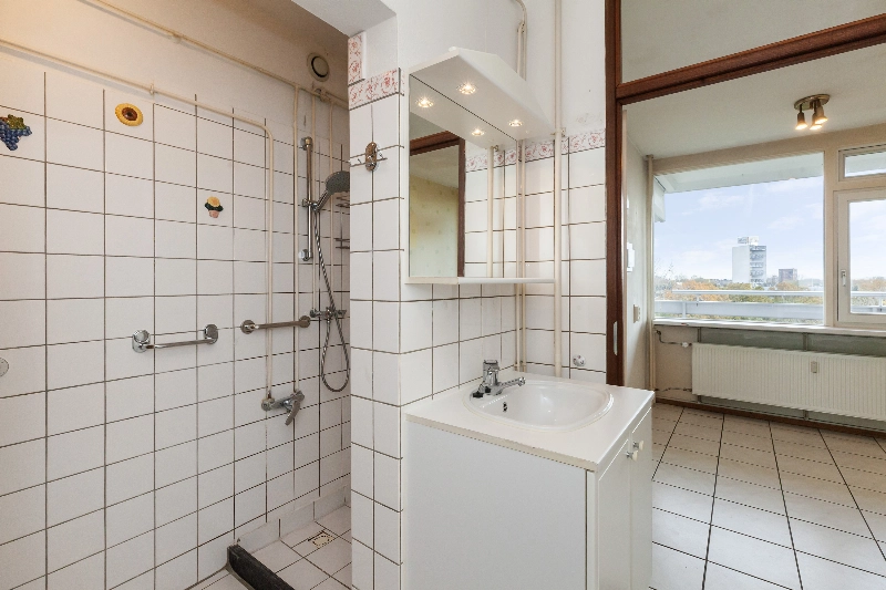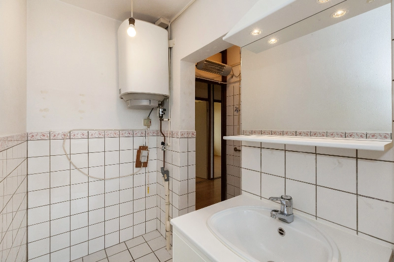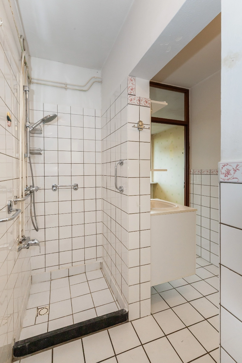 De badkamer is gedeeltelijk wit betegeld en voorzien van een douchehoek, wastafelmeubel en een 80L boiler (eigendom) voor het warme water.