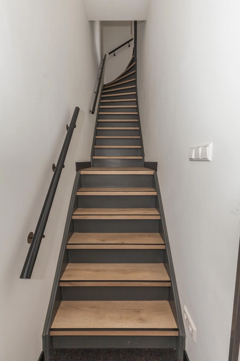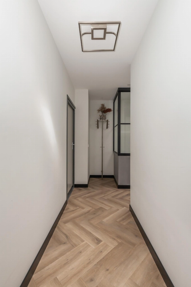 In de hal is een mooie bekleedde trap naar de woonverdieping. Eenmaal boven bereikt u een mooie overloop met een stalen pui en schuifdeur van Gers die het trapgat afsluit. U merkt hier meteen de ruimte en deze gehele verdieping is afgewerkt met een mooie PVC vloer in visgraatpatroon gelegd.