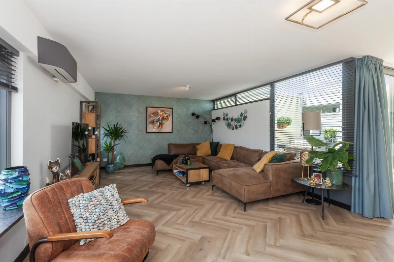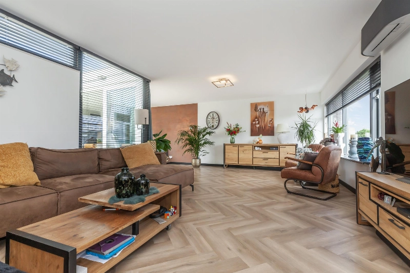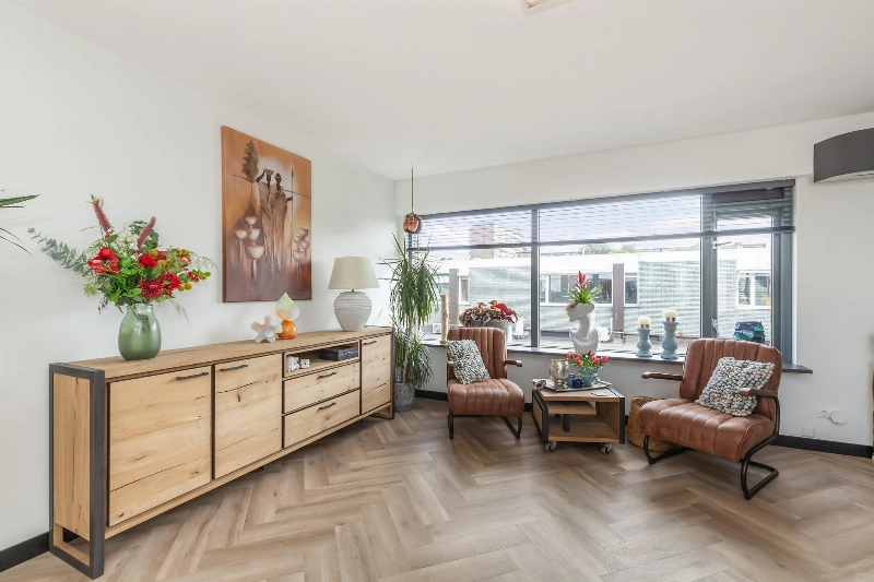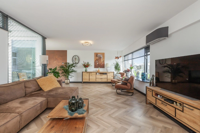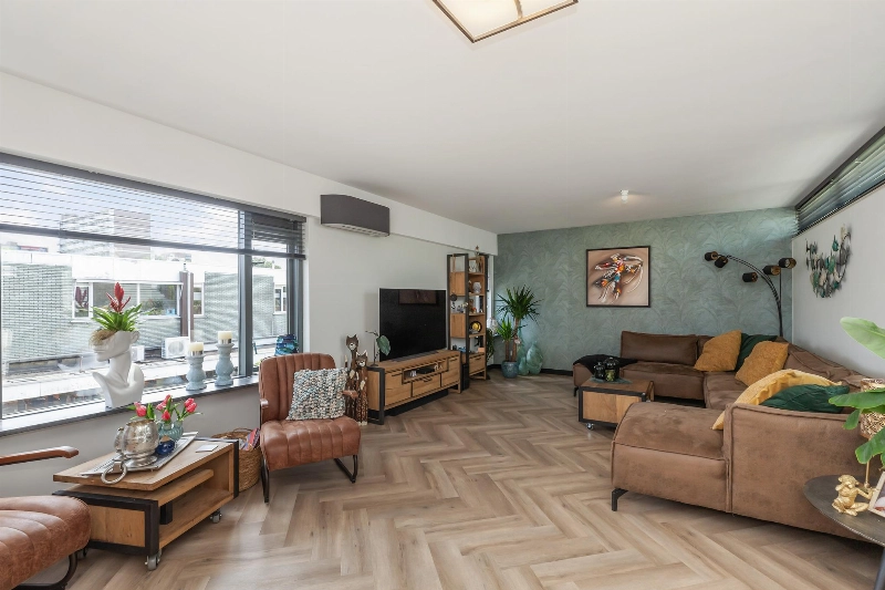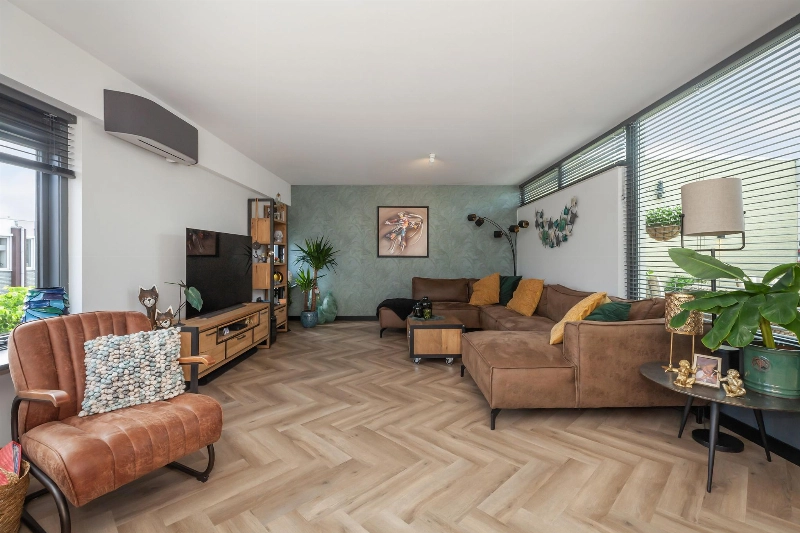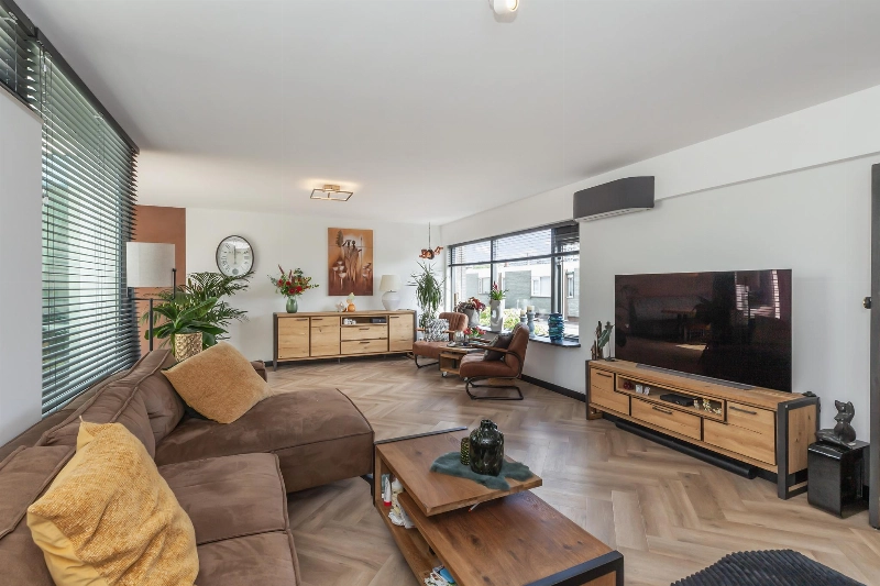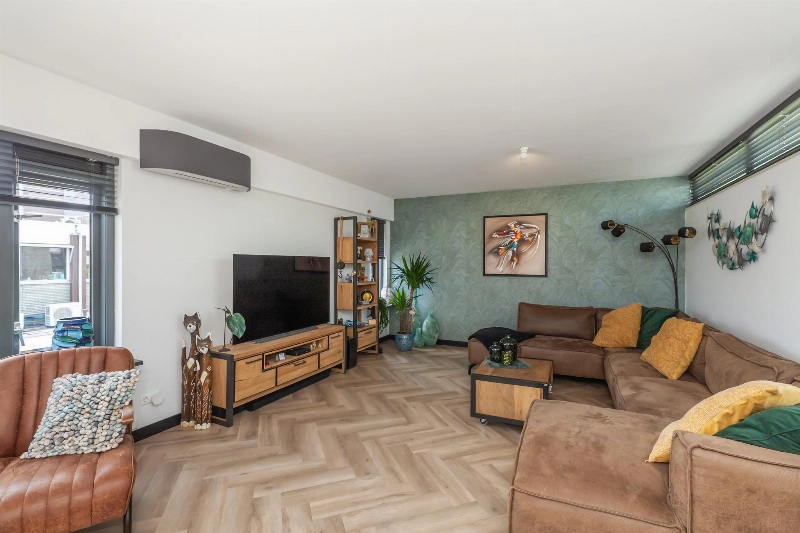 De woonkamer is een fantastische ruimte! Hier is genoeg plek voor een grote eettafel en om de hoek sluit daar naadloos de ruime zithoek op aan. De ramen geven leuk zicht op het winkelgebied en er is een airco voor de warme dagen. De schuifpui naar de patio is vernieuwd.