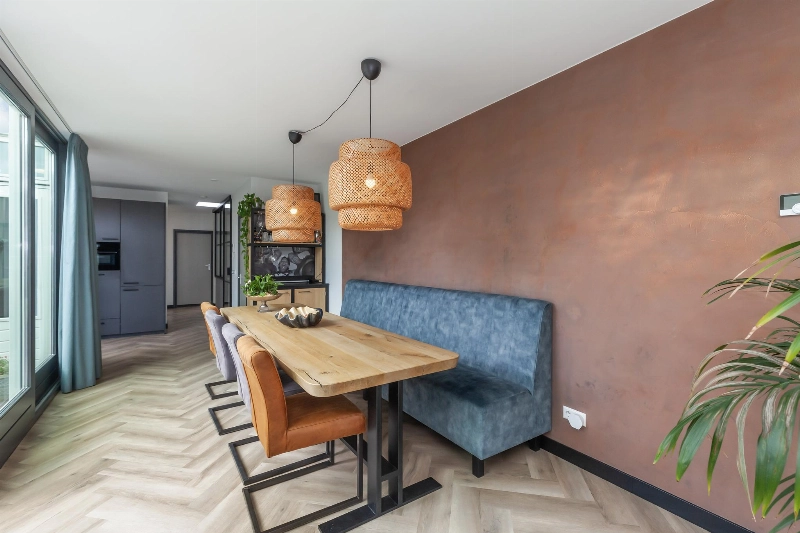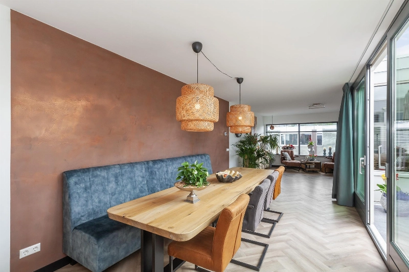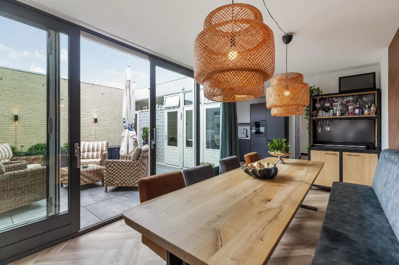 De woonkamer is een heerlijke ruime kamer met directe aansluiting op de patio van 25m². Deze kunt u via de nieuw geplaatste pui bereiken vanaf verschillende ruimtes.