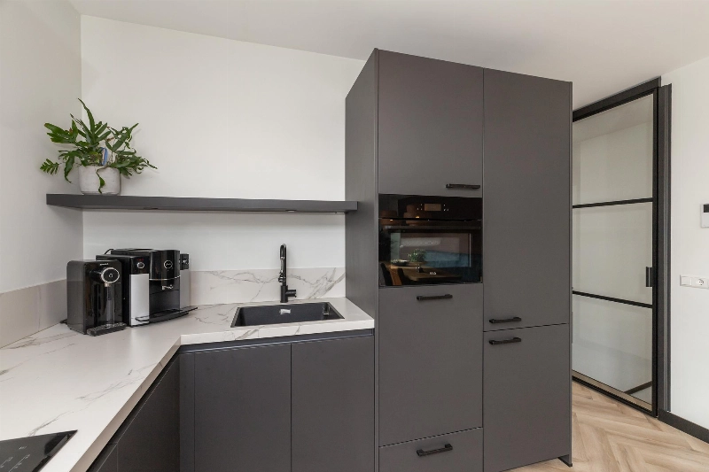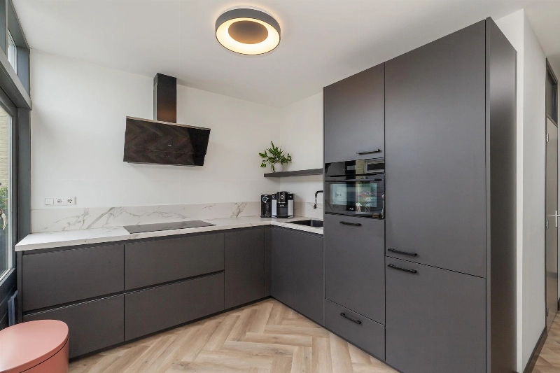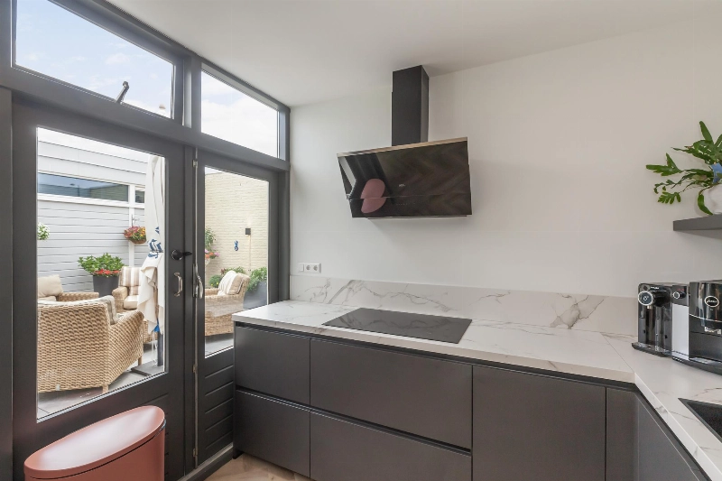 We lopen richting de woonkamer, langs de halfopen keuken. Deze keuken is voorzien van een moderne, grijze opstelling met kunststof marmerlook aanrechtblad en alle inbouwapparatuur zoals koelkast, vriezer, vaatwasser, combi-oven, inductiekookplaat en een afzuigkap. Via de dubbele openslaande deur bereikt u de patio.