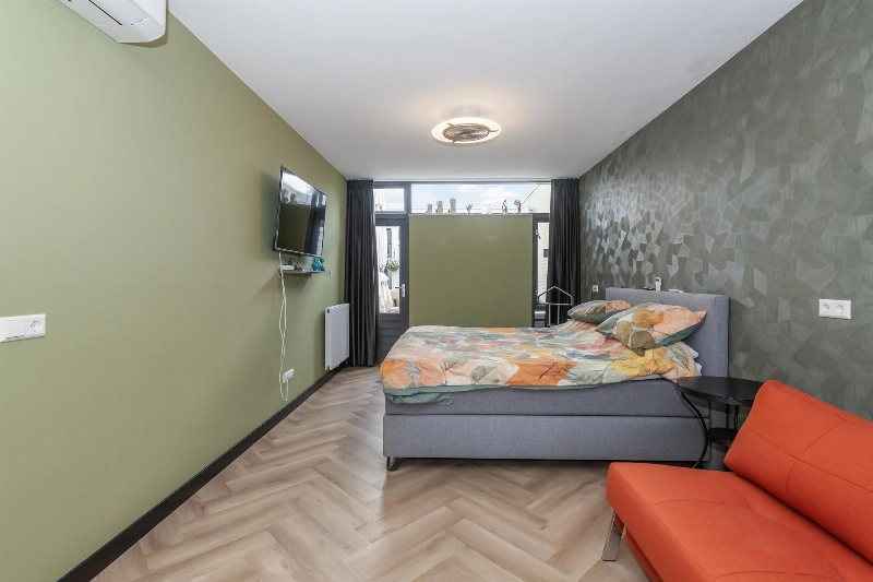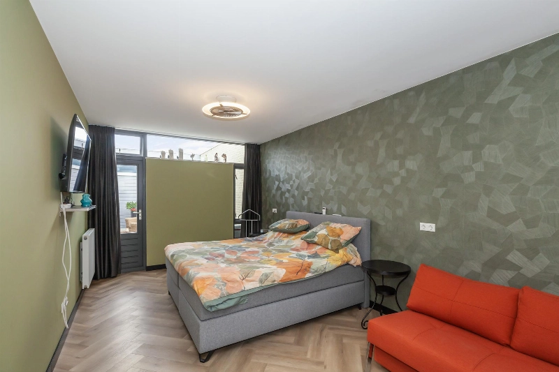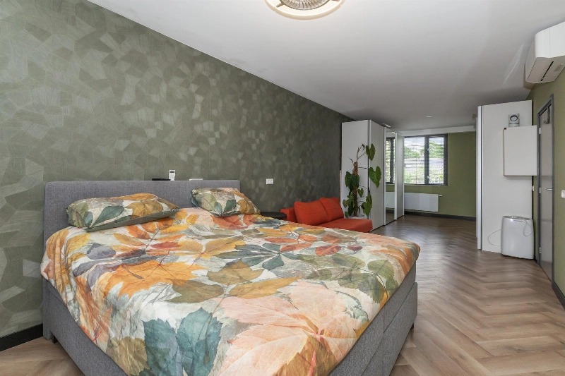 Slaapkamer II is bijna 10 meter diep en bestond oorspronkelijk uit twee slaapkamers. Deze kamers zijn samengevoegd waardoor u hier het gevoel van een hotelkamer heeft! Er is meer dan genoeg ruimte voor grote garderobekasten en u kunt uw bed aan de kant van de patio plaatsen. Er is een deur naar de patio aanwezig en ook deze kamer heeft weer airco. Liever weer twee kamers? Dat kan eenvoudig gerealiseerd worden.