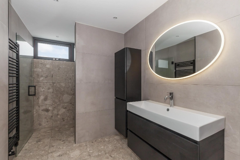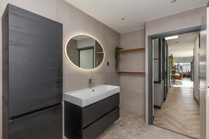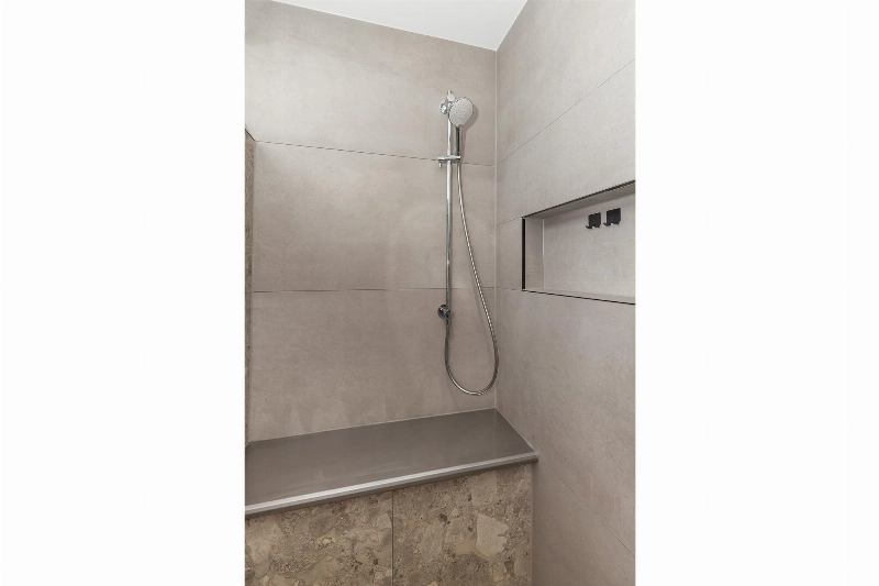 We gaan weer naar binnen en lopen via de gang naar de badkamer. Deze is luxe betegeld en omdat het voormalige zeembalkon bij de ruimte is getrokken is er nu een prachtige ruimte ontstaan. De vloerverwarming is hier elektrisch geregeld. Achterin is een ruime inloopdouche met drainafvoer. Verder is er een breed wastafelmeubel met zwevende kast en spots. Ook in deze ruimte is de pui en het glas vervangen.