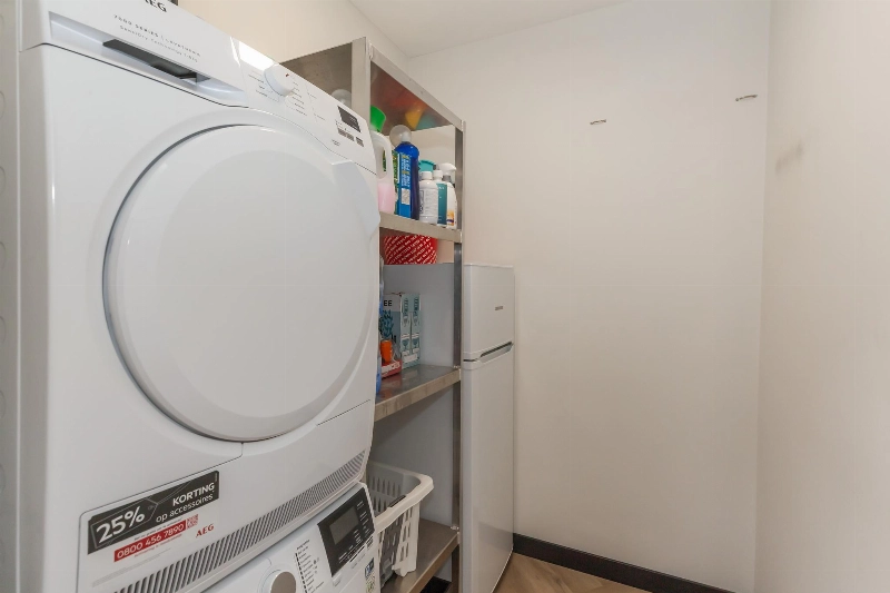 Op de overloop vindt u de luxe afgewerkte toiletruimte, een vast kast met uitgebreide meterkast en opstelplaats voor de CV. Om de hoek is een aparte wasruimte met opstelplaats voor de wasmachine en droger.