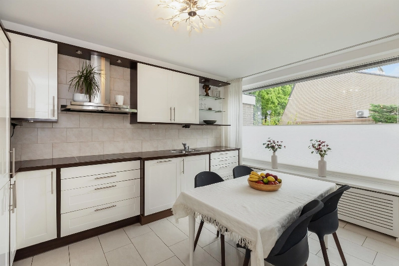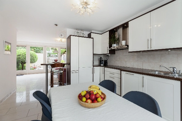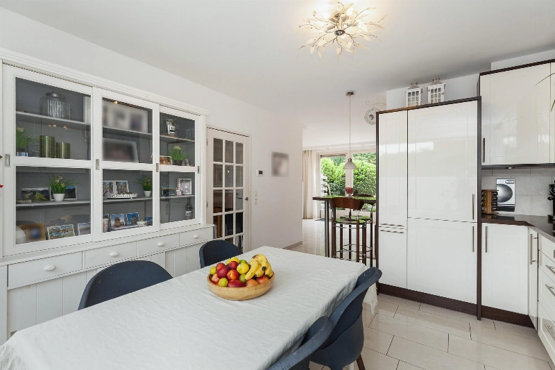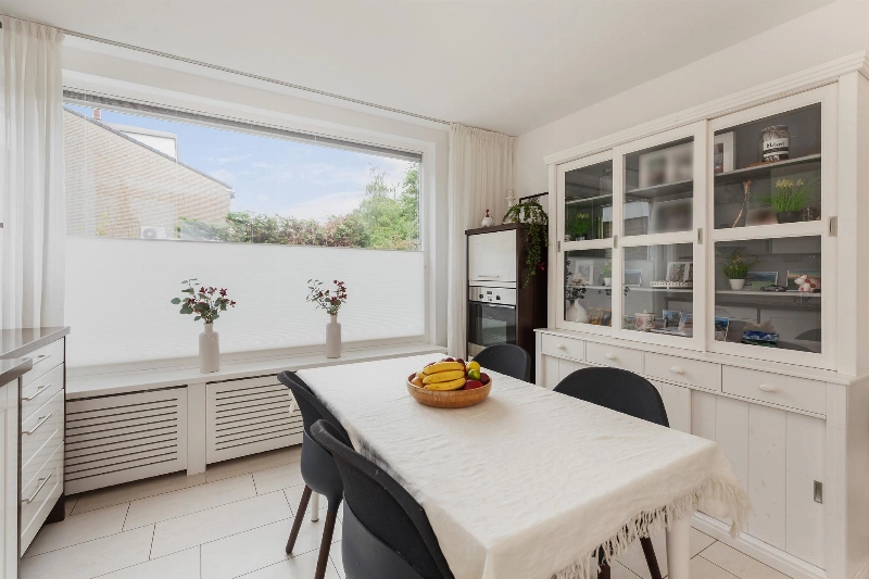 Achter de tussendeur kom je in de royale woonkamer, waar de slimme indeling direct opvalt. De keuken is verplaatst naar de voorzijde en vormt een fijne woonkeuken met leuk zicht op de straat. De keuken is uitgevoerd in een crèmekleurige hoekopstelling met een notenhoutlook afwerking en een composiet aanrechtblad. Alle benodigde apparatuur is aanwezig: een koelkast (2018), vriezer, afzuigkap, inductiekookplaat, vaatwasser, oven en een kastje voor de magnetron. Er is voldoende ruimte voor een eettafel – dé plek voor lange diners of een kop koffie aan de bar.