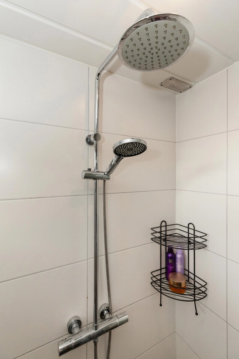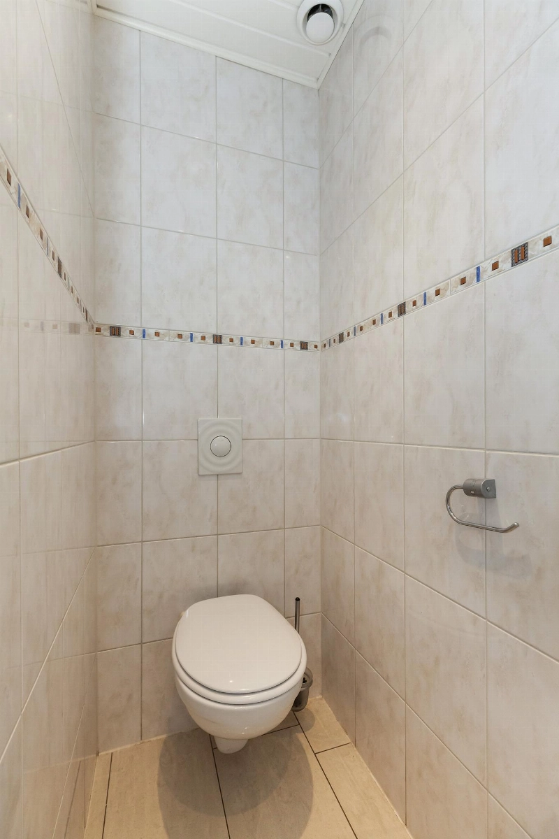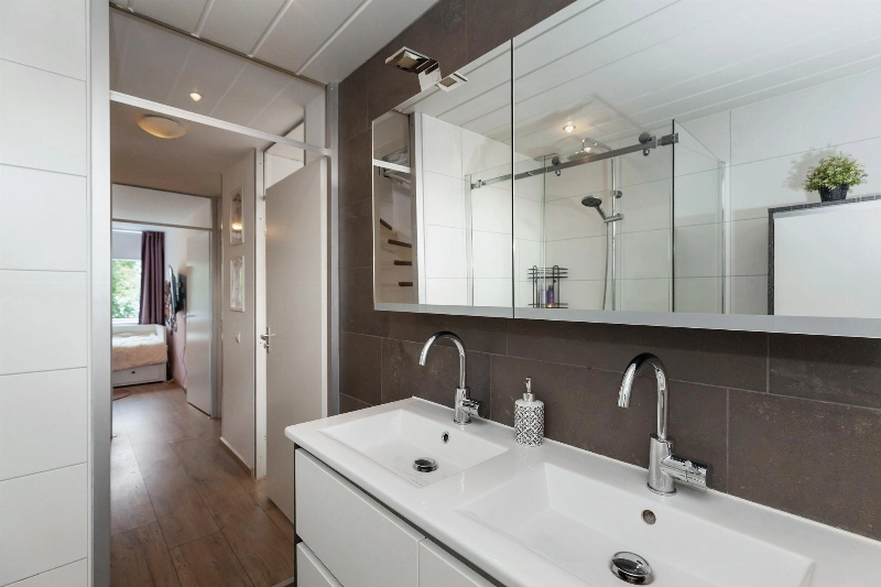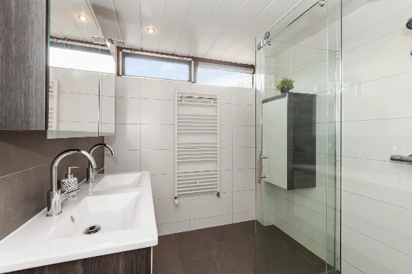 De volledig betegelde badkamer is praktisch én modern ingericht, met een inloopdouche, een dubbel wastafelmeubel, dubbele spiegelkast, een radiator en spots in het plafond. Met tevens een aparte WC.