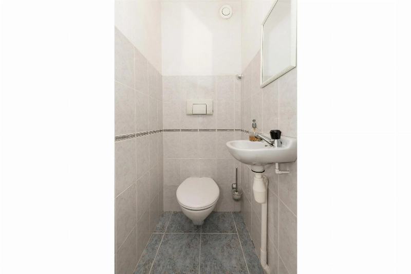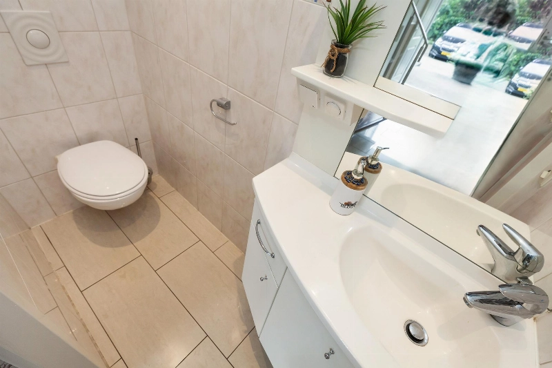 Via de diepe voortuin bereik je de entree van de woning. Eenmaal binnen valt direct de ruimte op: de ruime hal is voorzien van de meterkast, trapopgang en een modern afgewerkt toilet met wastafelmeubel, zwevend closet en mechanische ventilatie. De gehele begane grond is afgewerkt met lichte plavuizen en voorzien van vloerverwarming – comfortabel én onderhoudsvriendelijk.